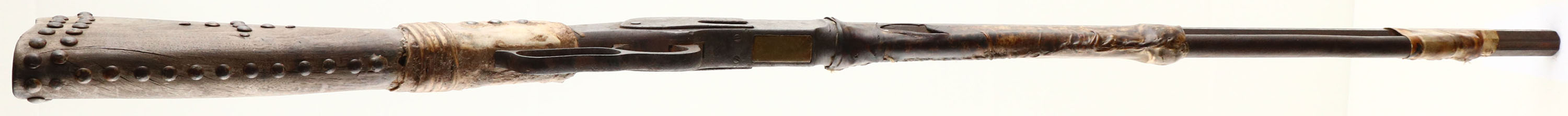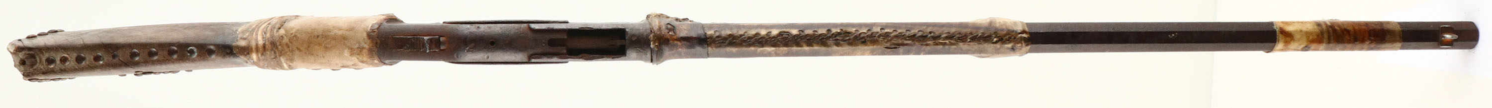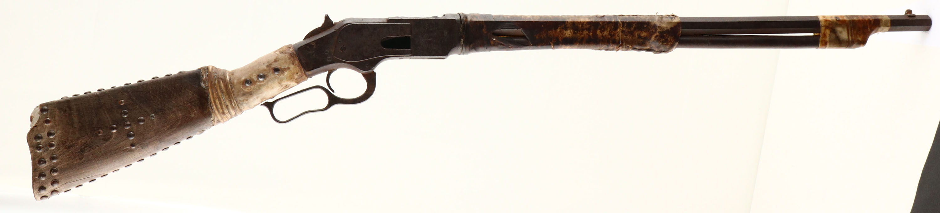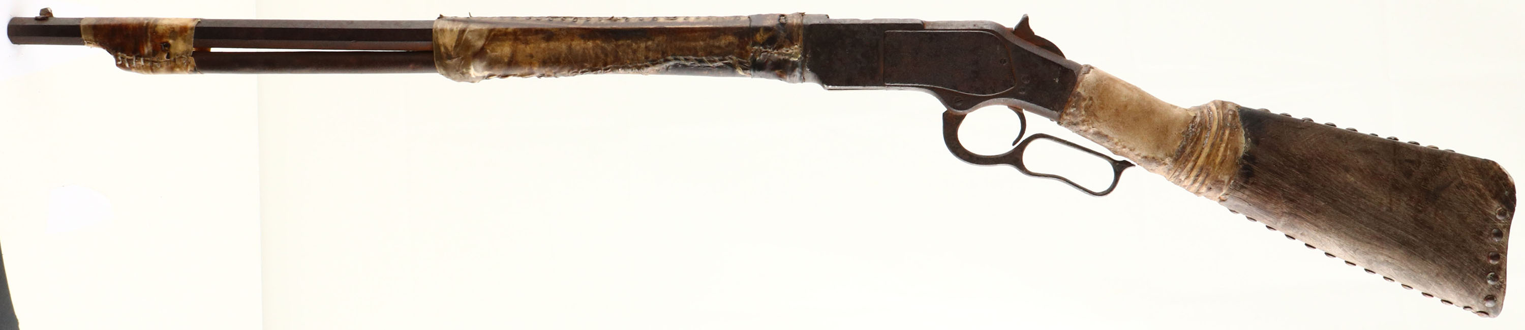 EARLY Winchester, Model 1873, 1st model, .44 WCF Cal., MFG: Antique, SN: N/A, Lever Action Rifle, 24'' Octagon barrel, 3/4'' mag. The is an early first model 1873. The serial number is not visible due to raw hide coverage. However, based on the shape of the lever, dust cover & concealed trigger pin, the rifle was made before 1876. The rifle is not in operational condition, rather it is a wonderful relic of an era gone by. The rifle sold decades ago in a California auction & was previously part of the John Beckwith collection. The rifle is heavily rusted & the action no longer moves. The lever is bent & the top of the hammer was broken long ago during use. The side rails of the frame where the dust cover once slide, shows prying & distress from hand ejection of cartridges. It is missing the loading gate & the mag tube appears to have been shortened to 3/4 length. It has no rear sight & an altered front blade sight. The raw hide wrapping on the center portion of the barrel & mag appears to be extremely old, showing sinew threads of an early Indian period (previously identified as from the 1870's). The hide on the muzzle end slightly later. The hide wrapped at the wrist is of a thicker hide, which was likely necessary to support a break at the wrist & is possibly from a later period. The original buttstock is sun bleached & very weathered. The buttplate is missing, which was very common to Indian owned rifles of this vintage, as most were removed to make hide scrapers for buffalo & other game. The stock carries corroded & well weathered iron tacks. A few are broken off or missing & show a square steel shank, correct to the period. The Indians were known to have repeating rifles at the Battle of Little Big Horn & this being a 1st model probably pre-dating 1876, it's a rifle that was of that era & makes for a great story. Antique, No FFL Req. - Value: 2000 to 4000