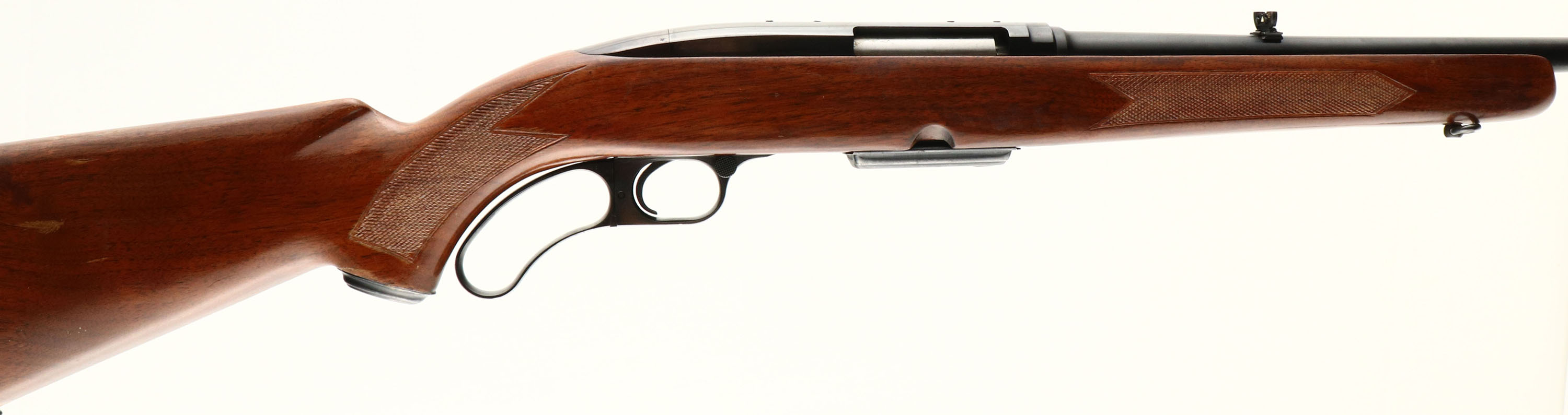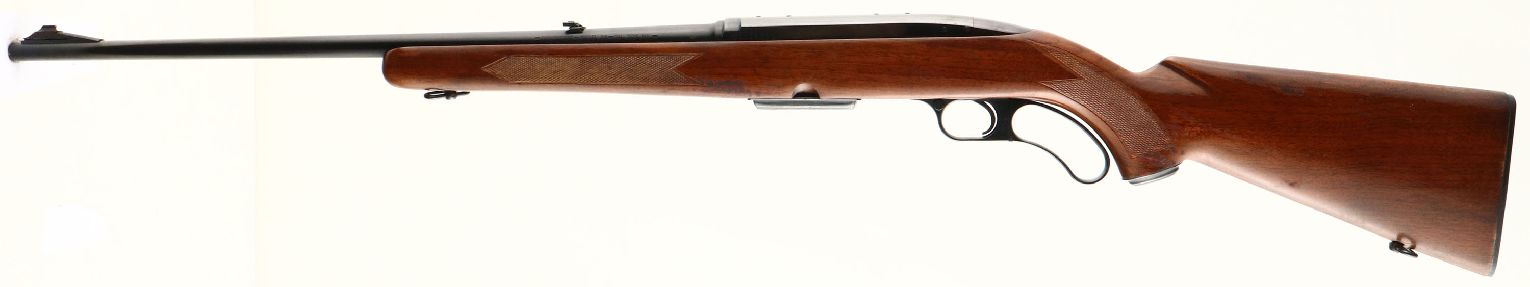 Winchester Model 88, CAL: 308 WIN, MFG: 1962, SN: 132550A, Lever Action Rifle, 22'' barrel. Pre-64. The original checkered & capped pistol grip wood stock is good. It displays several scrapes, scratches & contusions to the original finish, which has thinning & flaking wear, & has heat damaged, with area of foreign material stuck to it & finish removed. The original metal blue finish remains at 90%, with parts toning plum. Bore is excellent. The barrel holds the original flip-up rear sight & a ramp front sight missing the hood. Stock carries a the original checkered plastic buttplate. Sling swivels. Winchester detachable mag. FFL or C&R Req - Value: 400 to 800