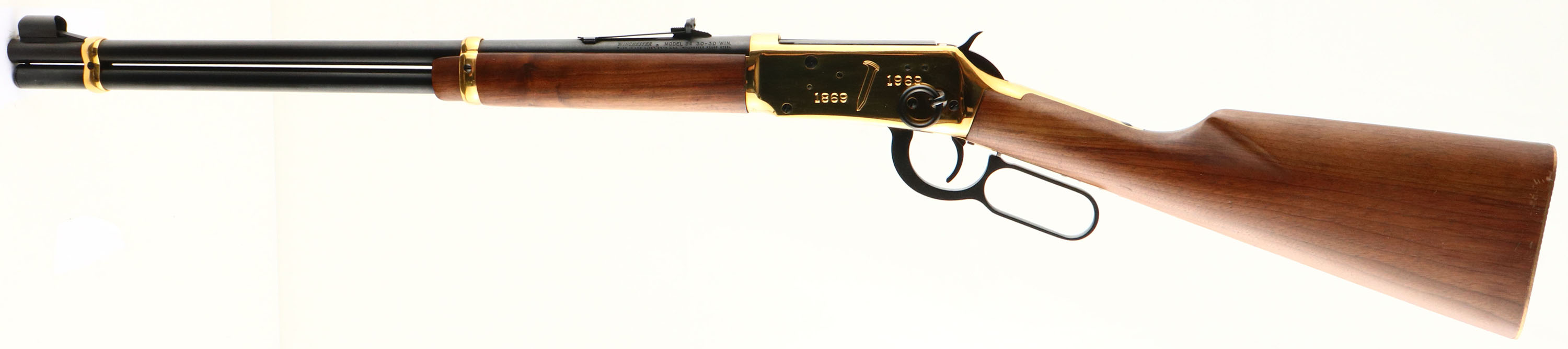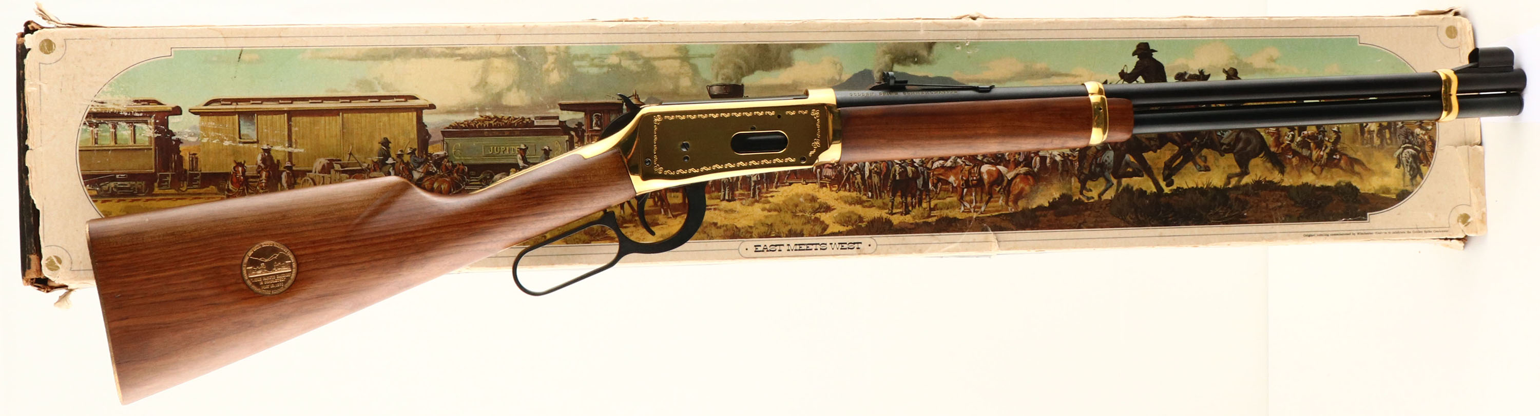 BOXED Winchester Model 94 SRC Golden Spike Commemorative, CAL: 30-30, MFG: 1969, SN: GS18105, Lever Action Rifle, 20'' barrel, full mag. The right side of the barrel is marked ''Golden Spike Commemorative''. There is an image of a Railroad Spike on the left side of the receiver, as well as the dates 1869 & 1969. The tang is marked ''Ocean's United by Rail.'' This rifle is in commemoration of the Pacific Railways completion in 1869. The straight grip wood stocks are excellent, displaying a few minor handling or storage marks. The metal blue finish on the barrel & tube rates 99% & the gold tone finish on the receiver is excellent, but with thin brush line. Bore is excellent. Factory sights. Stock carries a gold tone, checkered metal buttplate. Comes in original box, with the outer pictorial sleeve showing tears, tattering & wear. FFL or C&R Req. - Value: 600 to 1200