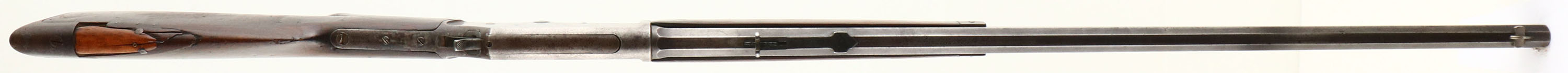 Marlin, Model 1881 Deluxe, marked 38-55 Cal., MFG. 1886, SN: 13294, Lever Action Rifle, 28'' Octagon barrel, Full mag. The original deluxe checkered & scalloped pistol grip wood stocks are fair. Much of the original checkering has smoothed due to heavy use. The forearm has a 2 1/2'' crack to the lower right side. The stock has a large 4'' broken chunk along the back of the comb, which has a few chunks nailed back into space, both original wood & an additional lighter toned piece of wood. There are numerous small scrapes, scratches & contusions. The metal surfaces have worn mostly gun metal gray, with a mix of spotty thin brown patina & remnants of original blue, mainly on the lower flats of the barrel. The receiver upper tang previously held a tang sight, with mounting screws remaining. Barrel carries an adjustable rear sight, with a replaced elevator & a Lyman half moon blade front sight. There are a couple of dents in the mag tube 1 1/2'' from muzzle. Bore is good, with some roughness amongst strong rifling. Stock carries a crescent metal buttplate. There is an open hole in front of the trigger under the lever. e action remains tight & smooth. The rifle has a well worn Old West esthetic & is an early era deluxe lever. Antique No FFL Req. - Value: 500 to 1000