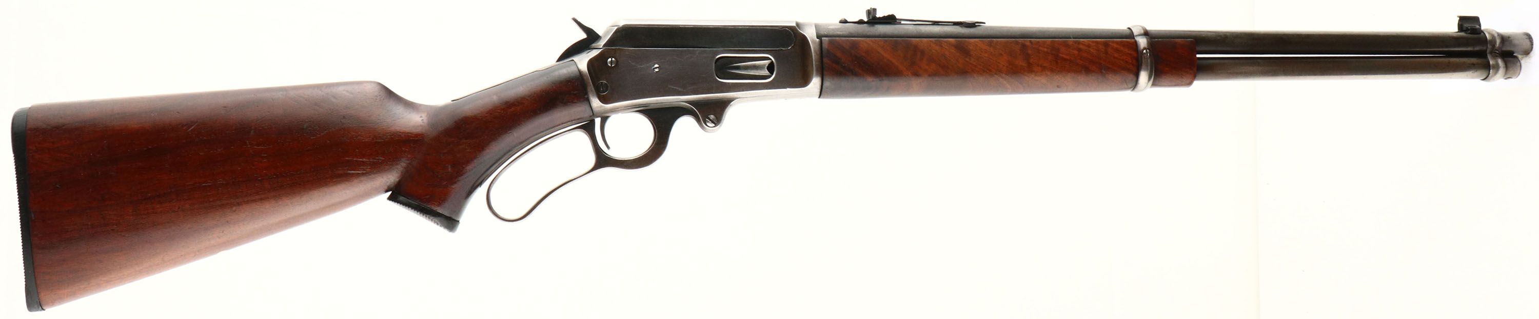 Marlin, Model 36 Carbine/Rifle, CAL: 30-30 WIN, MFG: 1947, SN: D18262, Lever Action Rifle, 20 1/4'' barrel, Full mag. The original flat pistol grip wood stocks are good & solid. The stock has been sanded & non-professionally refinished. The pistol grip has an added plastic cap. The forend has very nice rippled grain. The stock has a 1'' missing chunk at the buttend & near the comb. The original metal blue finish has worn mostly gun metal gray, with a thin brown patina & remnants of original blue. Bore is excellent. The barrel carries updated sights of Marbles adjustable rear & elongated tall blade front sights. Stock carries a Fajen plastic buttplate. Stock has the Marlin trademark bullseye in the stock. A good lever action 30-30 hunting rifle. FFL or C&R Req. - Value: 300 to 600