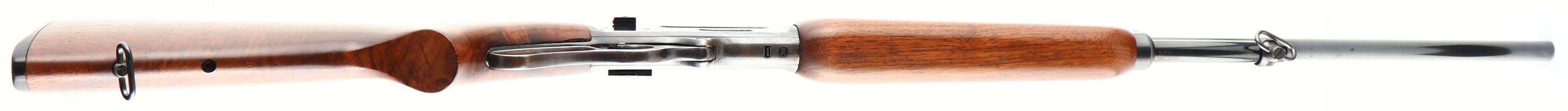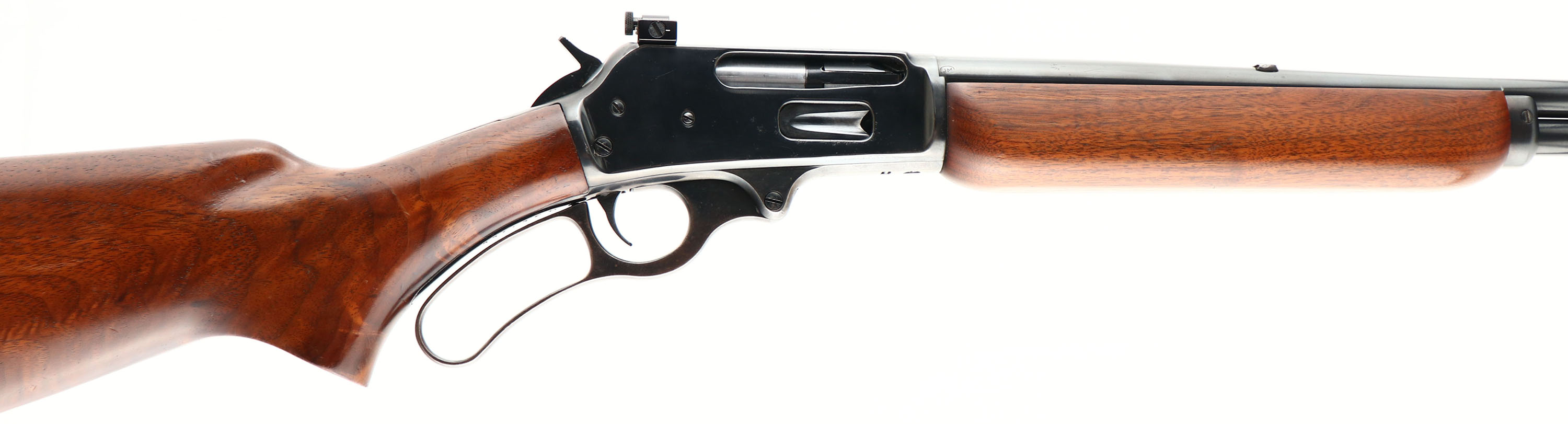 Marlin, Model 336 A, marked .35 REM Cal., MFG. 1951, SN: H310011, Lever Action rifle, 24'' round barrel, Full mag., The original flat pistol grip wood stock is very good & solid. The left side of the wrist has two tight grain cracks running from the upper to lower tang. The stocks have been sanded & nicely refinished, with the stock having very nice rippled & feathered grain. There remains a few small scratches or contusions. Marlin bull's-eye in stock is missing. The reblued metal blue finish rates 85% overall, with most wear on the belly of receiver & lever. The receiver mounted with a Williams side mount receiver sight, while the barrel carries a Marble blank filled rear dovetail & large blade front sight. Bore is excellent. Stock carries a Marlin plastic buttplate. Tight smooth action. Sling loops. A nice looking hunting lever action. FFL or C&R Req. - Value: 300 to 600