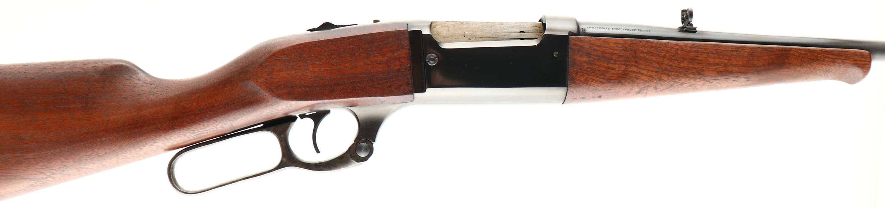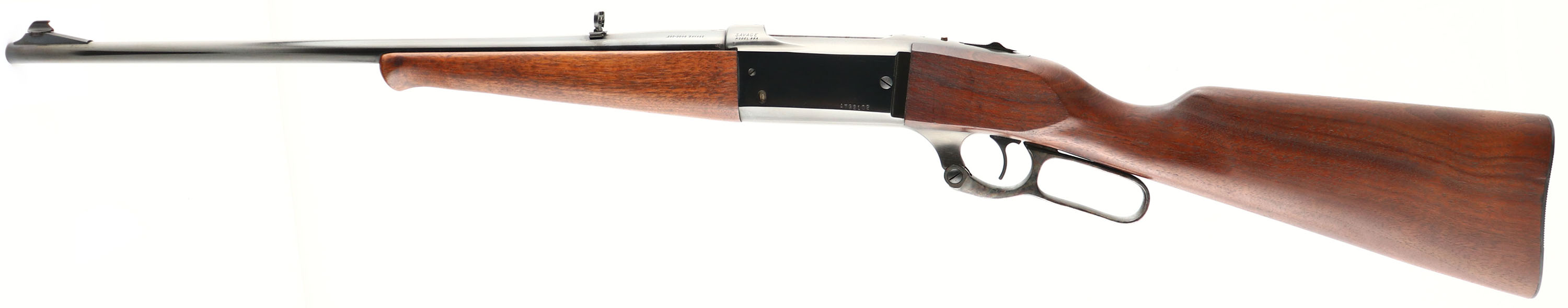 Savage, Model 99A, CAL: 250-3000 SAV, MFG: 1971, SN: A792102, Lever Action Rifle, 20'' round tapered barrel. The original smooth straight grip wood stock & schnabel forend are excellent. There are several tiny to minor handling marks, scrapes & light contusions mostly on the belly of the forend & to the excellent original finish. The original metal blue finish rates 98% on the barrel, 95% on the receiver, with portions of the receiver toning a plum/brown. The case-hardened lever retains very nice case-colors. Bore is excellent. The barrel holds an folding leaf rear sight & ramp elevated blade front sight. The stock carries the original grooved metal buttplate. An original & excellent overall vintage lever. FFL or C&R Req. - Value: 800 to 1500