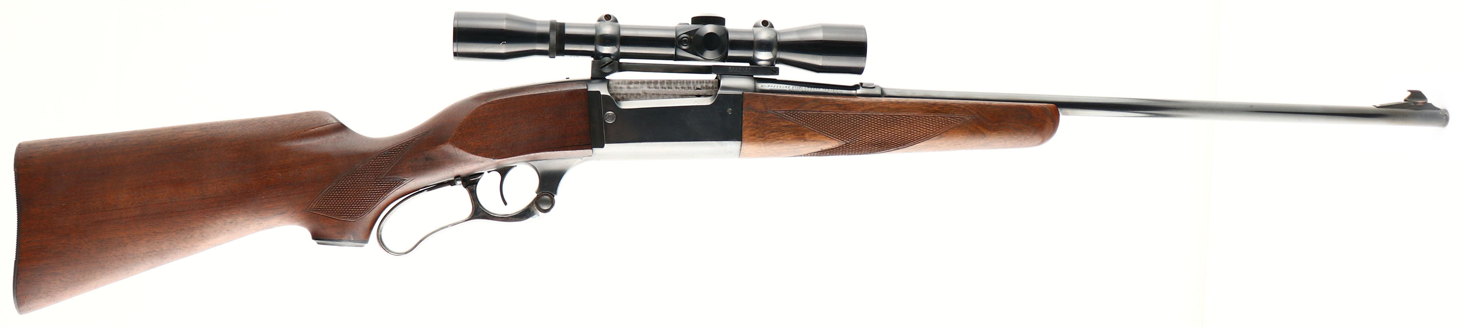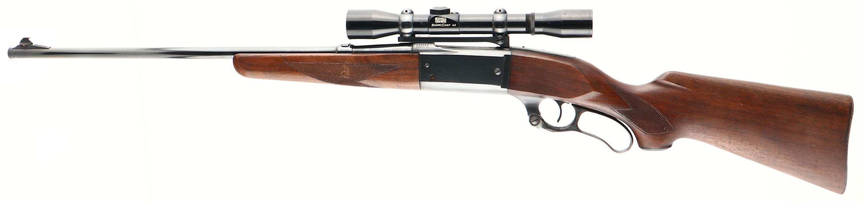 Savage, Model 99, CAL: 308 WIN, MFG: 1957, SN: 938111, Lever Action Rifle, 22'' round barrel. The original checkered & capped pistol grip wood stocks are very good & solid, despite a 2 1/2'' crack emanating from the end of the upper tang & 1 1/2'' stress crack along the lower edge of the right side of the wrist, coming off the receiver. There are a few scrapes, scratches light ding to the wood, with one larger contusion within the left side forend checkering. The original metal blue finish rates 90% on the barrel, 85% on the receiver. The case-hardened lever has faded mostly gun metal gray. Bore is excellent. The receiver carries a Bushnell ScopeChief 4x scope on Buehler mounts, while the barrel holds a blank in the rear dovetail & ramp elevated blade front sight. Grooved metal buttplate. Jeweled Bolt. Great overall appearance. FFL or C&R Req. - Value: 500 to 1000