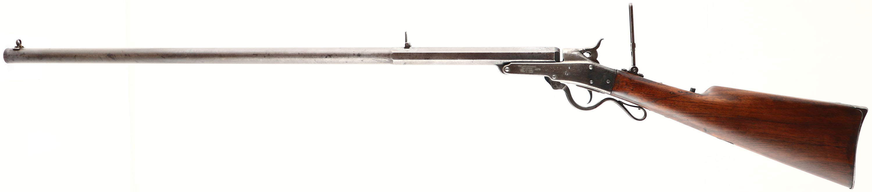 RARE Mass Arms Co. Edward Maynard Patent, Model 1873, Cal. 40-40 Maynard. MFG circa 1880's, Antique, SN: 26053. Single shot lever operated tip-up rifle. 32'' Octagon/round barrel. Dr. Edward Maynard (1813-1891) was both a brilliant dentist & a gifted inventor. Born in Madison, New York, Maynard entered the United States Military Academy at West Point, but was later forced to resign due to poor health. Prior to the Mexican War, Maynard invented a mechanical priming system for use with percussion arms, which was intended to replace the copper primers that had been used almost since the invention of this ignition system. Perhaps Maynard's most significant firearms invention was his tip-up single-shot metallic-cartridge breech loading rifle, which he patented in 1851. The Maynard First Model carbine was adopted by the U.S. Army in 1856, which sparked the formation of the Maynard Arms Corporation during the following year. The Massachusetts Arms Company of Chicopee Falls, Massachusetts, later undertook the manufacture of the Maynard rifles & carbines. The Massachusetts Arms Company continued to produce Maynard rifles until 1890. The smooth straight, grip walnut stock appear original & is good & solid, despite there being a 3'' crack repair on the left side of the wrist, which utilized three pins to stabilize. The stock has been sanded & refinished. There remains minor scrapes, scratches & dings, with the metal edges being proud to the wood. The buttstock carries a silver color upper tang metal buttplate. The metal blue finish on the barrel has mostly worn to a gun metal gray, with a thin brown patina & remnants of original blue in protected areas. The case-hardened receiver, lever & lower tang have all worn gun metal gray. Markings on left side of receiver are double stamped in 4 lines: ''Edward Maynard'' ''Patentee 1873'' ''May 27, 1851'' ''Dec 6, 1859''. Markings on right side of receiver are 3 lines: ''Manufactured by'' ''MASS ARMS CO'' ''Chicopee Falls''. The rifle mounted with a Vernier tang peep sight with elevation adjusting aperture base missing the aperture. The barrel carries a flip up two leaf rear sight & folding globe front sight. Bore is very good & clean, but with so areas of light roughness amongst strong rifling. Some of the screws show slot wear. Action is very tight, barrel to receiver has no play & appears to function well. Overall condition is very good, as all parts appear original & complete.* Antique, No FFL Req - Value: 1000 to 2500