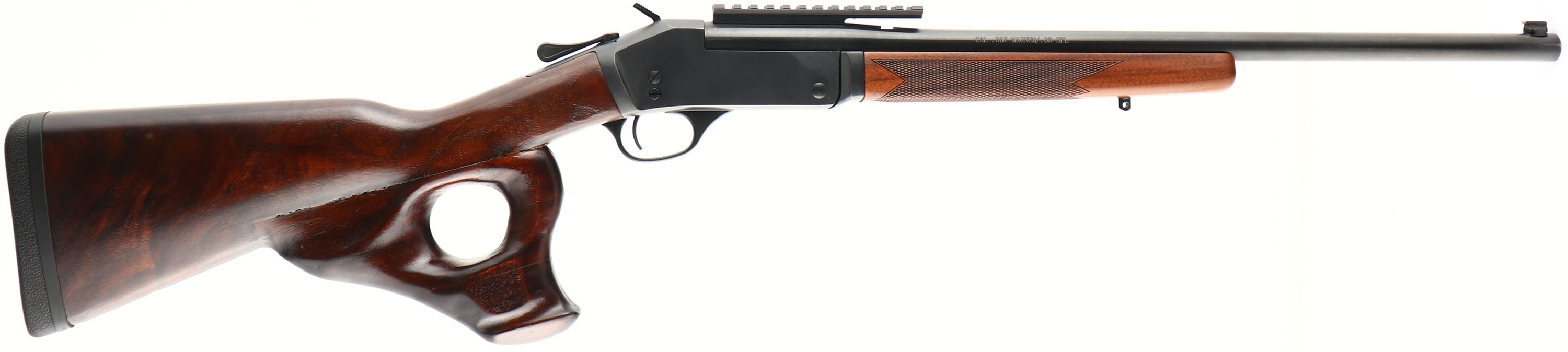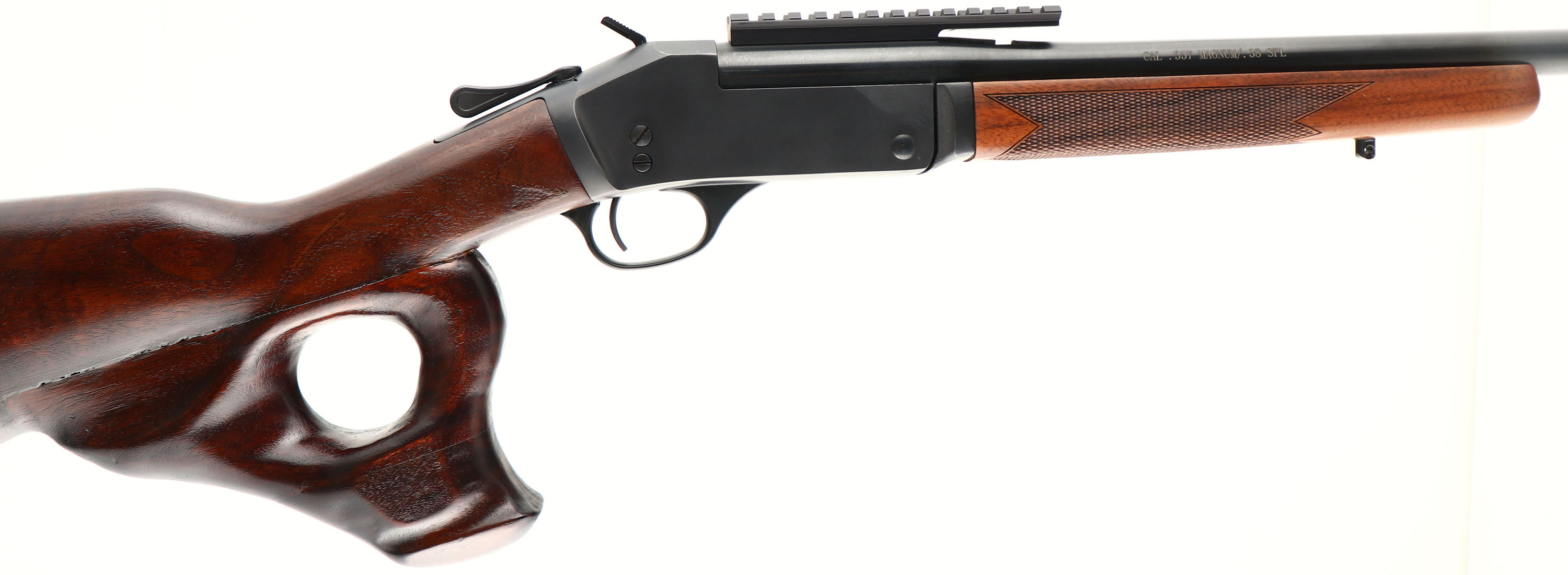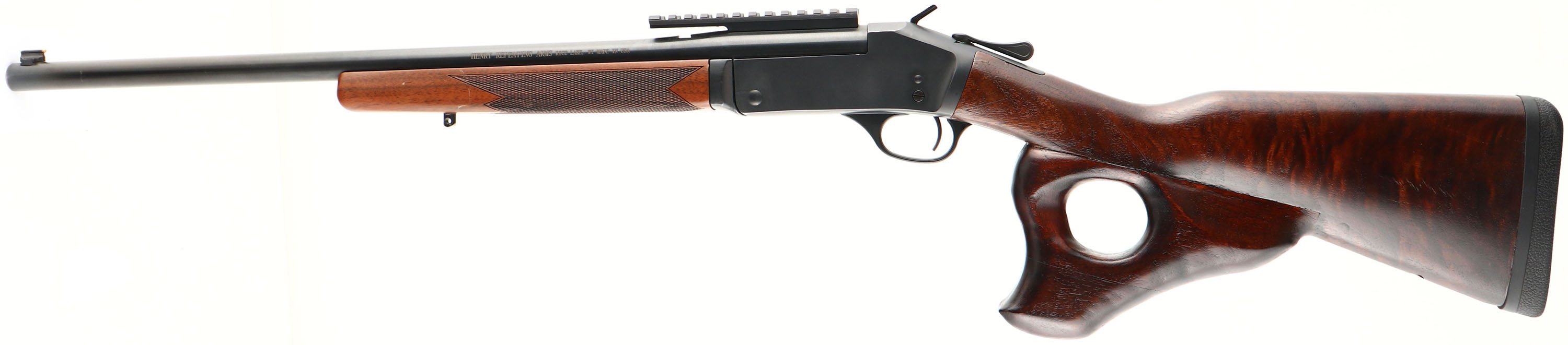 Henry Repeating Arms Company, Model HO15-357 Single Shot, Caliber: 357 MAG/ .38SPL, MFG: Modern, SN: 357SSR00313, Break Action Single Shot Rifle, 22'' Barrel. The factory stock has been heavily custom modified, with the addition of a hand sculptured thumb hole pistol grip. The stock has a shiny refinish. The individual who created this unusual configuration was quite the wood worker! The wrist still retains the outlines of the original checkering, with matches the original & excellent checkered forend. There are a few minor scratches & contusions. The original metal blue finish rates 98%. Bore is excellent. The back portion of the barrel carries a Henry 5'' picatinny rail for optic mounting, while the rear dovetail is open & the muzzle end holds a blade front sight. Buttstock carries a solid recoil pad. Sling stud on forend, missing in stock. Truly a uniquely modified rifle, that does shoulder very comfortably. FFL Req. - Value: 200 to 400