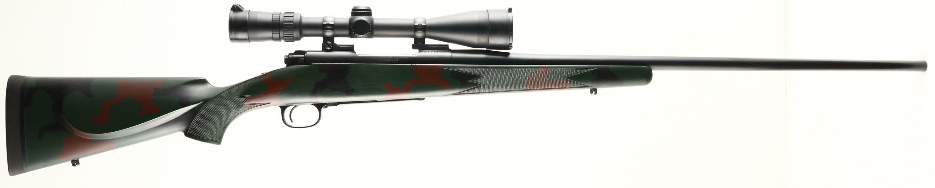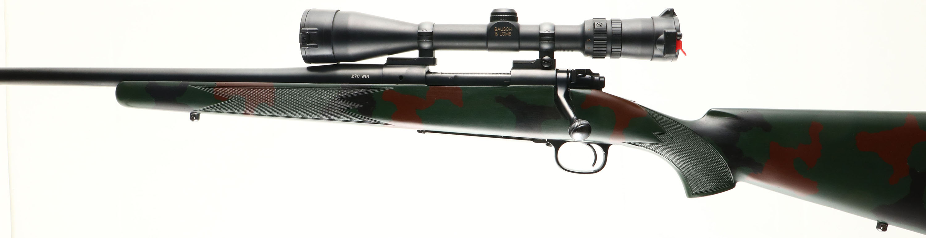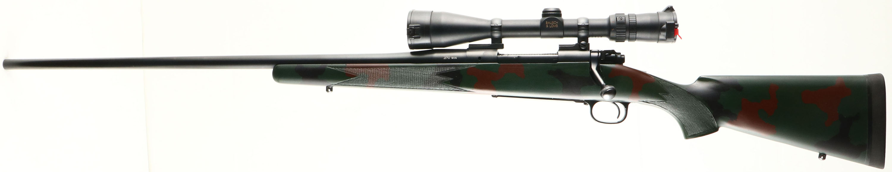 Winchester, Model 70 LEFT HANDED, CAL: 270 WIN, MFG: 1990's, SN: G174100, Bolt Action Rifle, 25 3/4'' barrel. The cheeked, checkered & flat pistol grip, camo synthetic stock is excellent. The original metal blue finish rates 95% overall. Bore is excellent. The receiver holds a Bausch Elite 4000 2.5-10X40 Waterproof scope, with flip-up caps. while the barrel has no open sight provisions. Solid rubber recoil pad. Sling studs. LEFT HANDED. FFL Req. - Value: 500 to 1000