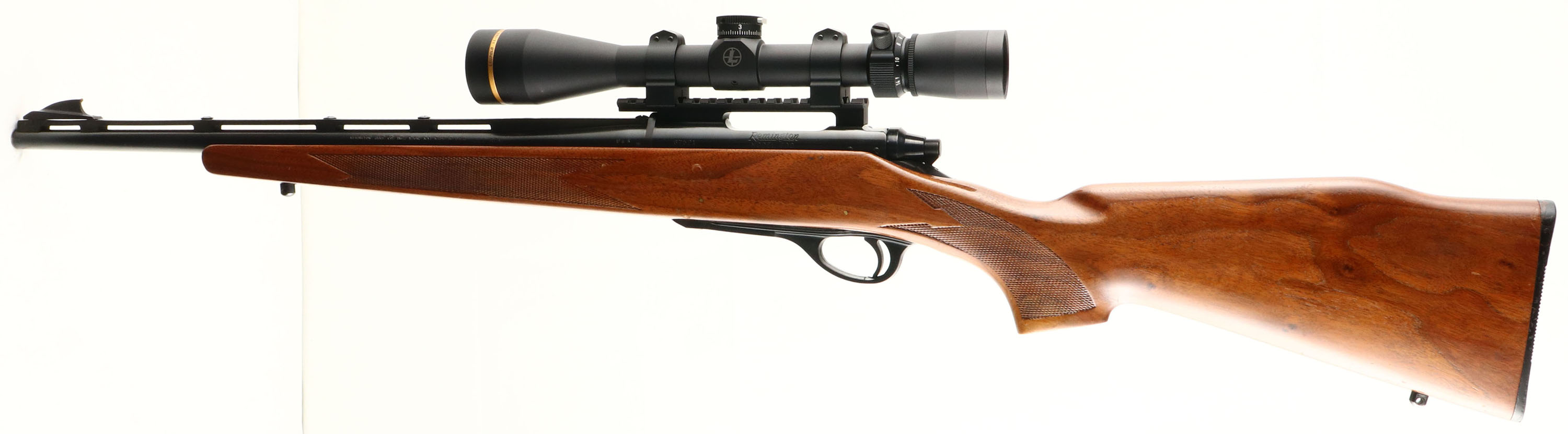 Remington, Model 600 Carbine, CAL: .222 REM, MFG: 1966, SN: 67521, Bolt Action Rifle, 18 1/2'' barrel. The original press checkered, raised comb & flat pistol grip wood stock is excellent, with a few small scuffs & contusions to the original finish. The metal blue finish rates 98% overall. Bore is excellent. The receiver carries a Leupold VX-3HD 4.5-14X40 Gold Ring scope mounted on a EGW REM 660 0MOA Picatinny rail. The rear sight has been removed from the ventilated rib, but it still carries the elevated blade front sight. Buttstock carries a Remington plastic buttplate. Dog leg bolt handle. Sling studs. A great little compact hunting rifle & nicely set up. FFL or C&R Req. - Value: 800 to 1200