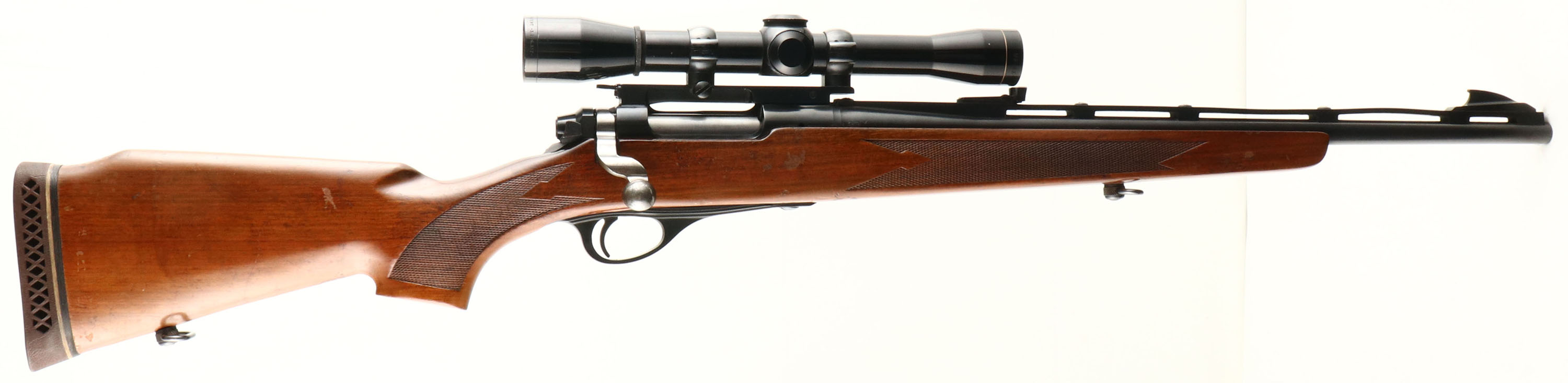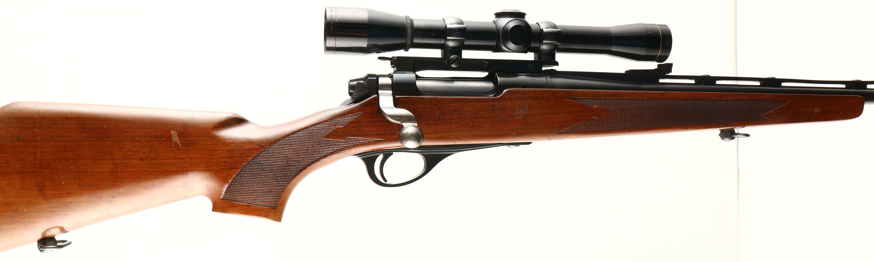 Remington, Model 600 Carbine, CAL: 222 REM, MFG: 1964, SN: 2796, Bolt Action Rifle, 18 1/2'' barrel. Early first year production rifle. The original press checkered, raised comb & flat pistol grip wood stock is excellent, with a several small scuffs & scrapes to the original finish. The metal blue finish rates 95% overall. Bore is excellent. The receiver carries a Leupold M8-4X Gold Ring scope mounted on Redfield rings & rail. The ventilated rib carries the original rear & elevated blade front sights. Buttstock carries a Pachmayr ventilated recoil pad. Dog leg bolt handle. Sling loops. A great compact bolt rifle & set up for hunting season. FFL or C&R Req. - Value: 700 to 900