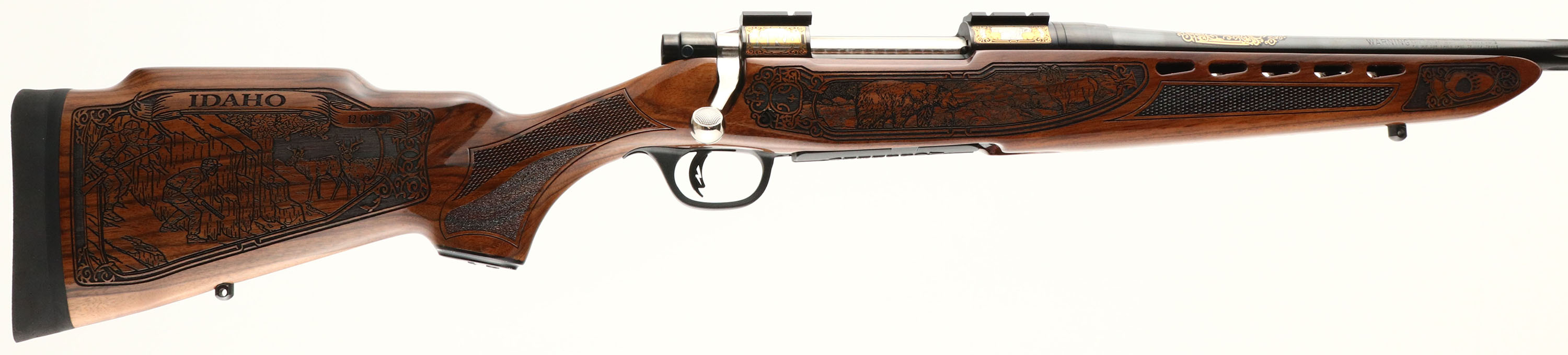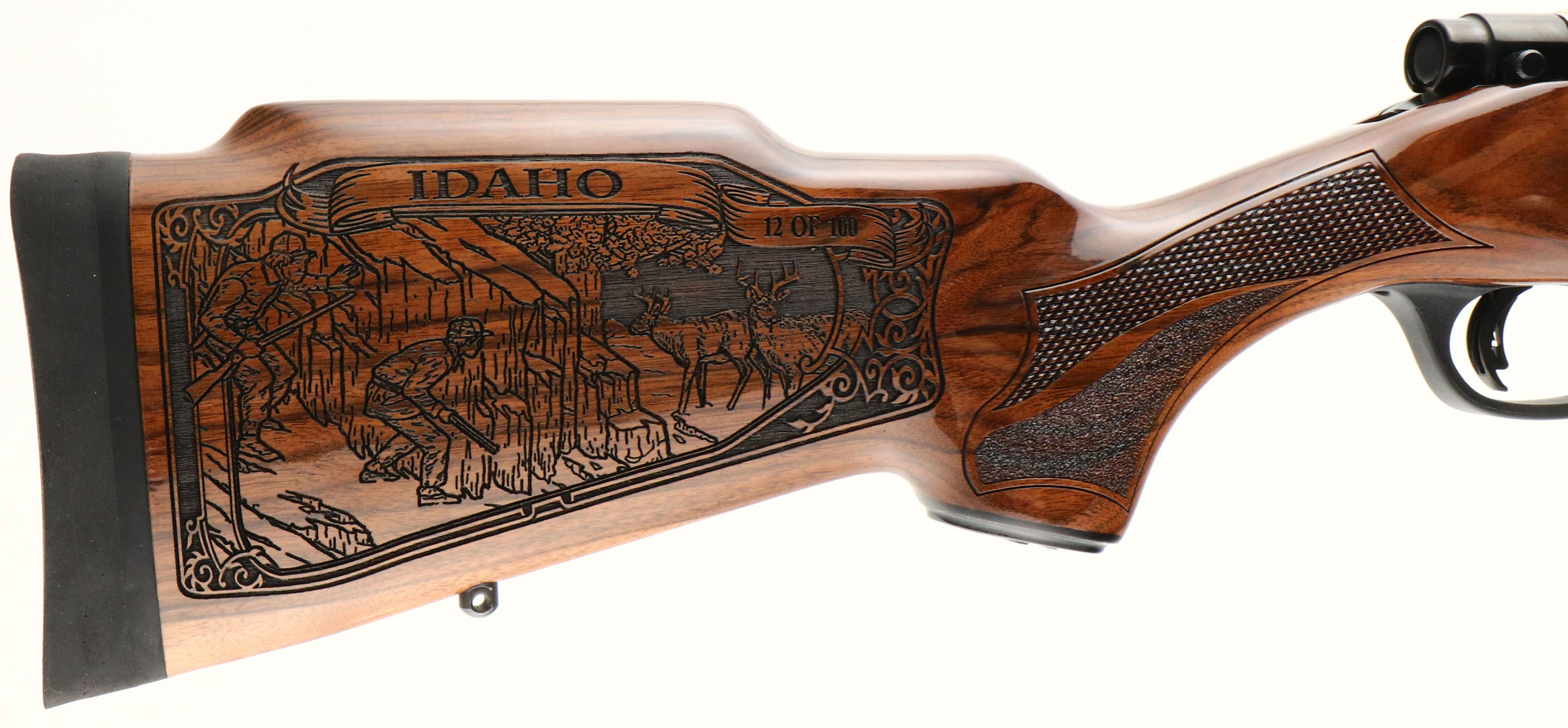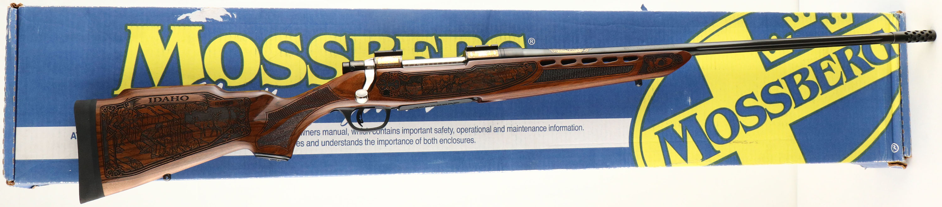 BOXED Mossberg O F & Sons Inc, Model 4X4 NRA Limited Edition, State of Idaho Hunting American tradition rifle. CAL: 300 Win Mag, MFG: Modern, SN: BA275333, Bolt Action Rifle, 25'' Tapered & fluted round barrel, 26 3/8'' with muzzle break. This beautiful rifle is numbered on the right side ''12 of 100'' & features etched & gold/silver filled NRA motifs & game scenes on the receiver & barrel. The original capped pistol grip walnut stock is excellent, & features laser cut games & hunting scenes on both sides, with the under side of the forend marked ''National Rifle Association''. The original metal finish 99% overall. Bore is excellent. The receiver is fitted with scope mounting blocks, & no open sight provisions on the barrel. Stock carries a factory solid recoil pad. Sling studs. Detachable mag. Two-position safety. Jeweled bolt. Comes in the original SN matching box, with paperwork & lock. FFL Req. - Value: 800 to 1200