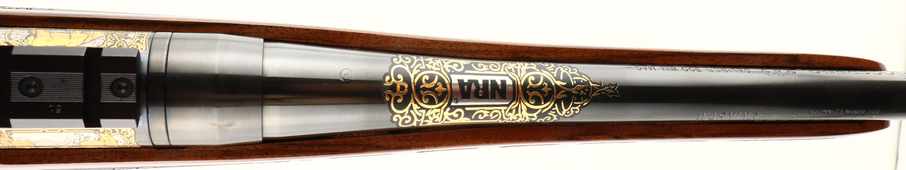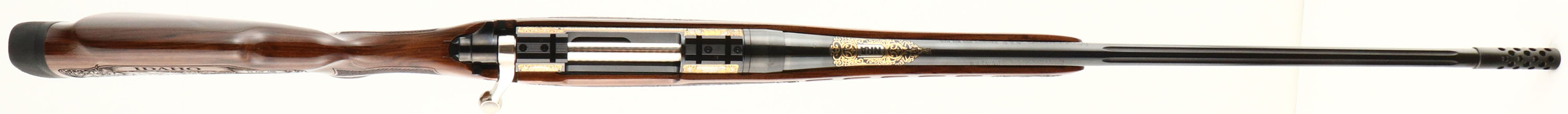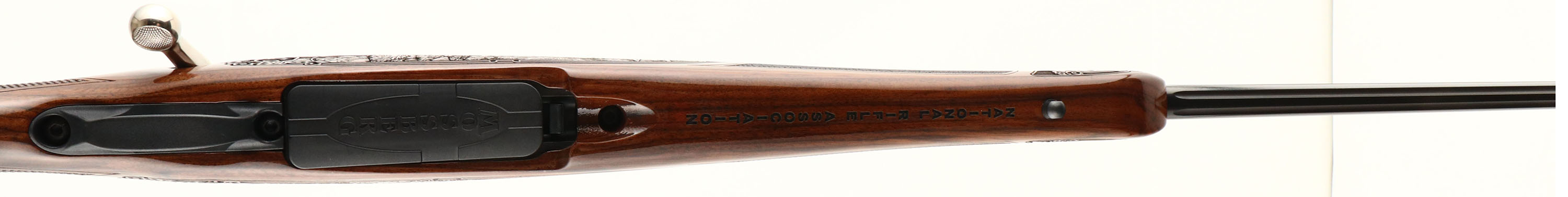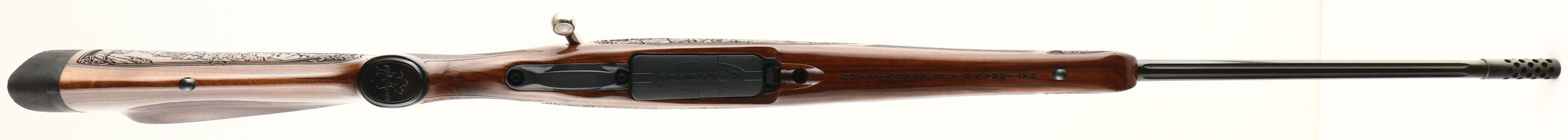 BOXED Mossberg O F & Sons Inc, Model 4X4 NRA Limited Edition, State of Idaho Hunting American tradition rifle. CAL: 300 Win Mag, MFG: Modern, SN: BA275333, Bolt Action Rifle, 25'' Tapered & fluted round barrel, 26 3/8'' with muzzle break. This beautiful rifle is numbered on the right side ''12 of 100'' & features etched & gold/silver filled NRA motifs & game scenes on the receiver & barrel. The original capped pistol grip walnut stock is excellent, & features laser cut games & hunting scenes on both sides, with the under side of the forend marked ''National Rifle Association''. The original metal finish 99% overall. Bore is excellent. The receiver is fitted with scope mounting blocks, & no open sight provisions on the barrel. Stock carries a factory solid recoil pad. Sling studs. Detachable mag. Two-position safety. Jeweled bolt. Comes in the original SN matching box, with paperwork & lock. FFL Req. - Value: 800 to 1200