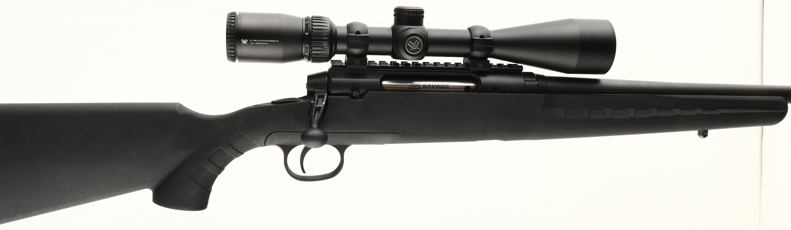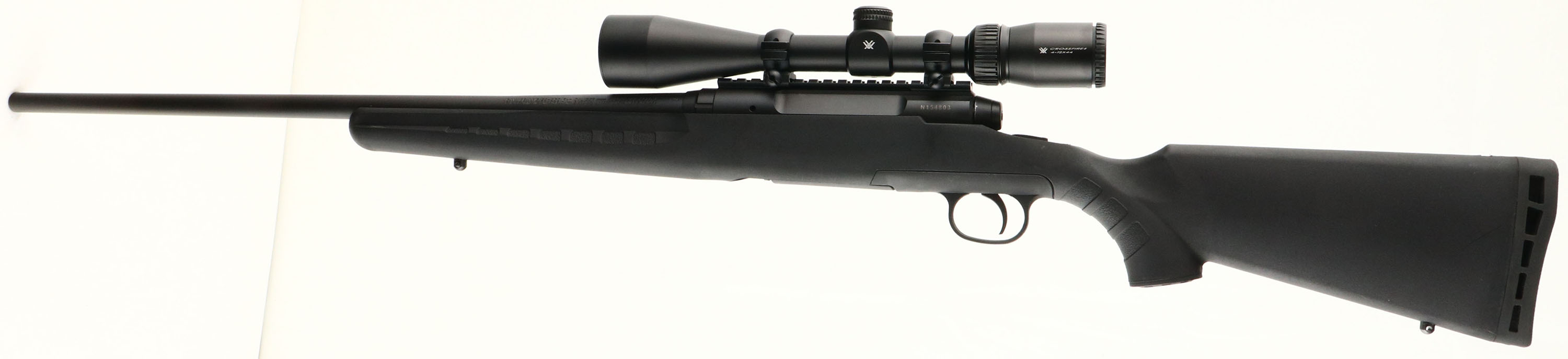 Savage, Model Axis, CAL: .22-250 REM, MFG: Modern, SN: N154803, Bolt Action Rifle, 22 1/4'' Tapered round barrel. The original capped pistol grip synthetic stock is excellent, with very minor rubs or light use marks. The original metal finish 99% overall. Bore is excellent. The receiver is fitted with a Vortex Crossfire 4-12x44 scope, & no open sight provisions on the barrel. Stock carries a factory ventilated recoil pad. Sling studs. Detachable mag. FFL Req. - Value: 400 to 600