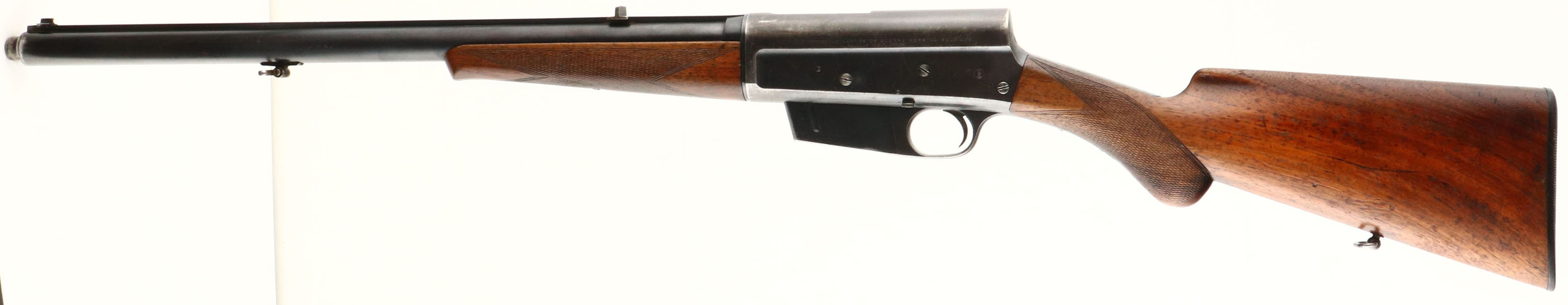 RARE FN (Fabrique Nationale), Model 1900, .35 Rem Cal., MFG. 1910-36, SN: 240, Semi-Auto Rifle, 22'' barrel, In Belgium it was known as ''La Carabine Automatique Browning'', in Germany it was the ''Selbstladebchse Browning Kaliber 9mm'', but in the U.S. we know it simply as the F.N. 1900. Records indicate only 4,913 Modele 1900's were ever produced. While records indicate 2909 rifles were produced for the years 1910-21, with no allocation to a particular year during that time, it is likely that SN 240, is a first or 2nd year production rifle. This rifle, invented by John Browning, was one of Europe's first successful semi auto high-power rifle. FN obtained the rights to produce the rifle as early as 1902, however, they chose to focus their production efforts on the A5 shotgun, which they acquired production rights to at the same time. They correctly viewed greater consumer sales potential in the A5. By 1904 restrictive importation tariffs into the U.S. caused Browning to negotiate with FN to allow manufacture of his shotgun within the U.S. The Remington Arms Co. was eager to work with John Browning & acquire the rights to manufacture both his autoloading shotgun & his autoloading rifle. FN was first to introduce the long-recoil shotgun (A5), but it was Remington that first produced John Browning's long-recoil rifle in 1906, dubbed the ''Autoloading Rifle'' or more commonly known today as the Model 8. If the Remington Model 8 is the grandfather of American semi-automatic sporting rifles, the F.N. 1900 is its European twin. The FN model 1900 was marketed throughout the world except the U.S., while the model 8 was intended for the U.S. market. Production comparisons place the model 8 at around 70,000, nearly a 14 to 1 difference. Since the FN was not sold in the U.S. market, few examples of the limited 4913 total produced are found amongst collectors in the U.S. It is known that some were vet bring-backs from two World Wars & at least a few were imported by Val Browning into the US. Since the FN was exported to Canada, some have made their way south of the border. Regardless of how they arrived, they are rare & very desired amongst Remington 8 & 81 collectors. Produced with old-world craftsmanship, these rifles are a testament to Fabrique Nationales word-wide reputation for manufacturing high quality firearms. It doesn't take long to notice there were probably more hours of labor involved in producing the FN over the Remington. A close inspection & disassembly of both rifles will reveal a significantly superior fit & finish with the Belgium made version, even over early production Model 8s. The FN came in two versions, neither of which were a higher grade than the other. One version had a standard barrel jacket like the Model 8, the other a solid barrel rib running the length of the jacket, which is the case with this example. These take-down rifles were often broken down into the 22'' & 20'' halves & placed into travel cases. The rifle has an English walnut round knob pistol grip stock & schnabel tip forend. Hand cut factory checkering is 20 lines-per-inch, with the early 1st style forearm checkering pattern. All hand fit & assembled, to that point stocks do not always interchange one rifle to another & factory LOP can vary by as much as a full inch. The stocks original condition is excellent, with thinning finish wear, minor handling scuffs, scratches & dings. The original metal blue finish is approximately 85% overall, with blue thinning at the carry points of the receiver & barrel & some minor scratches. The left side of the receiver carries the factory roll stamp & proof markings. Bore is very good. Barrel is fitted with replacement fixed rear sight & Lyman front sight. FN horn buttplate. Replaced sling loops. Some denting to the belly of the magazine. Tight action & functions as it should. An overall excellent & eye catching example of this rare & highly collectible early production rifle. FFL or C&R Req. - Value: 3000 to 4500