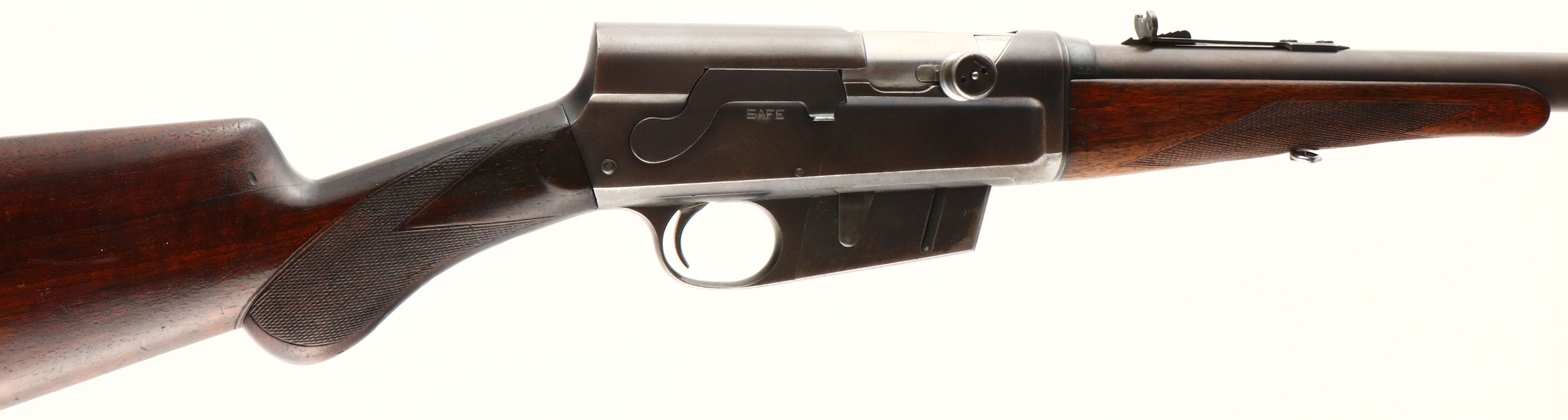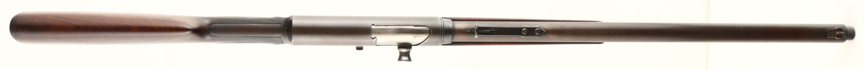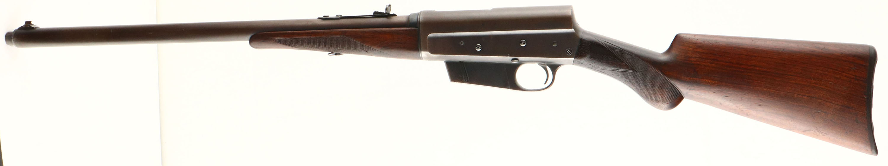 Remington, Model 8C (Deluxe), marked .32 Rem Cal., MFG: 1909, SN: 16907, Semi-auto take-down rifle, 22'' barrel, The original deluxe checkered & round knob pistol grip wood stocks are excellent & solid. The inside of the forend is stamped with a 3 for grade ''3'' or ''C'' grade, & they display hand checkering cut at 20 lines per inch. Being an earlier production rifle & a C grade, the stock carries the cheeks at the wrist. There are minor scrapes, scratches & contusions to the original finish. There are two thin & tight grain or stress cracks emanating from the upper tang & running rearward. The original metal blue finish is toning to a thin brown patina, with mostly full coverage. Some area have worn gray, while other areas retain darker blue finish. The receiver has an open factory hole from previous tang sight, while the barrel carries an adjustable rear & standard front sight. Bore is very good, clean & bright. Stock carries the Remington plastic buttplate. 5 rd fixed magazine. Tight action. A rare & very nice original ''C'' grade deluxe rifle, which is very collectible. FFL or C&R Req. - Value: 2000 to 3000