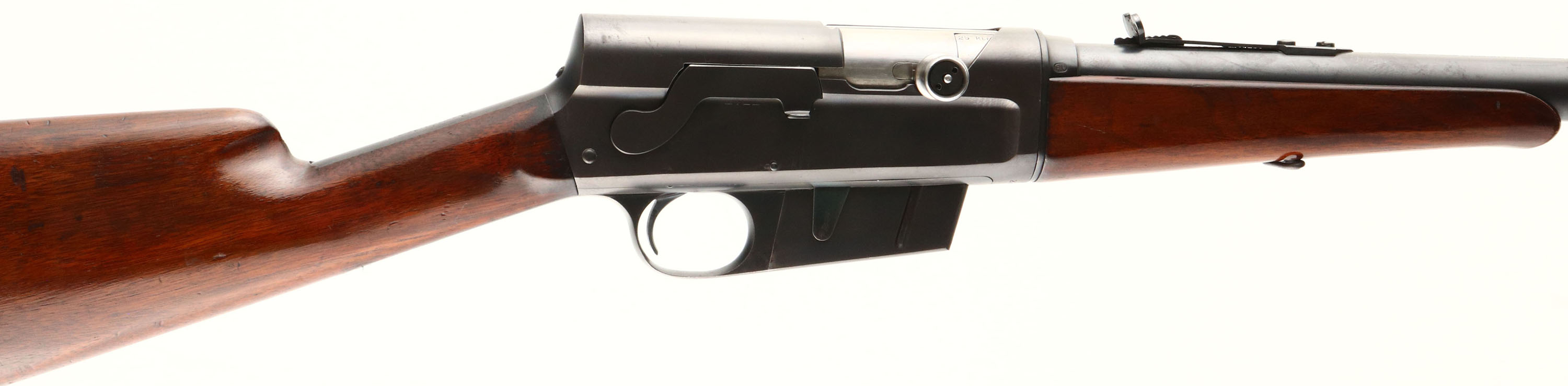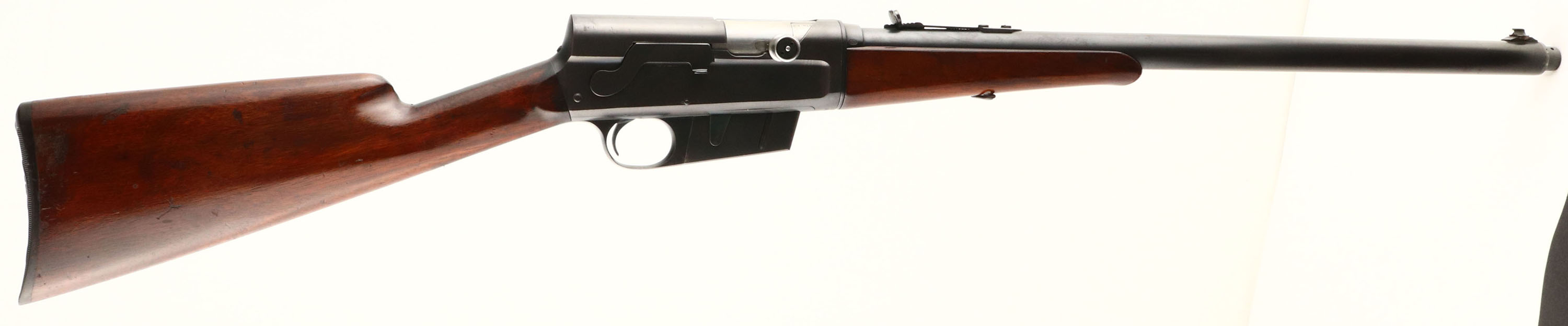 Remington, Model 8, .25 Rem Cal, MFG. 1912, SN: 29092, Semi-Auto Rifle, 22'' barrel. The original straight grip & schnabel forend stocks are excellent, with both appearing to carry the original finish, with a layer of added finish over the original. There are minor scuffs, scratches & contusions to the wood, & several larger scrapes to the lower half stock, mainly on the left side. The original metal blue finish rates 90% on the receiver, 85% on the barrel. Bore is good. Barrel is fitted with standard adjustable rear & blade front sights. Buttstock carries a Remington UMC plastic buttplate. 5 round fixed magazine. Tight action. The safety lever has some issues & doesn't always allow for trigger pull when open & won't always close into safety position either after pulling the trigger or before. We strongly recommend this rifle visit a gunsmith or knowledgeable repair individual to adjust or repair the issue before attempting to fire rifle. This is one of the rarer calibers & other than repair issue, a nice looking rifle. FFL or C&R Req. - Value: 600 to 800