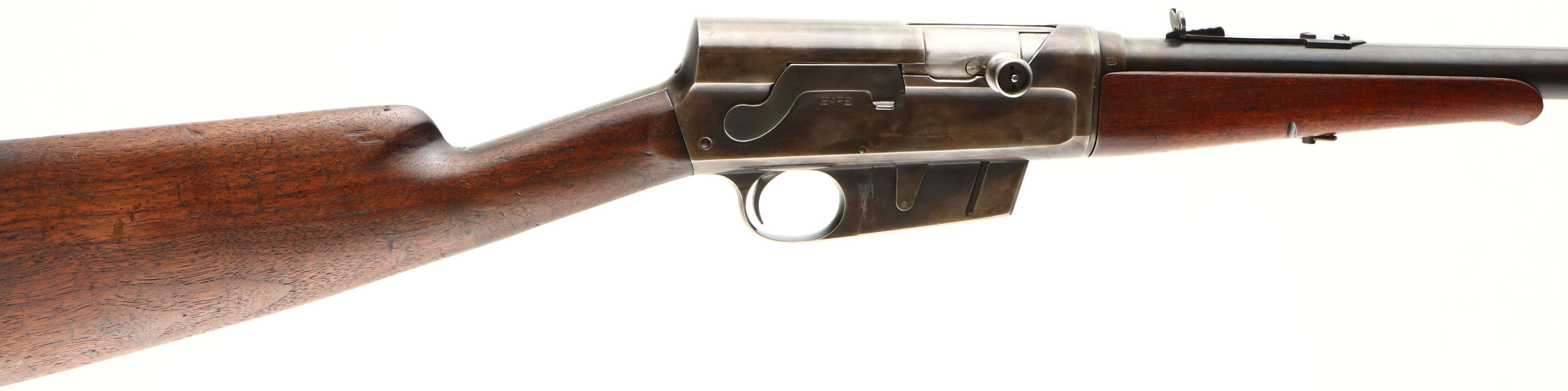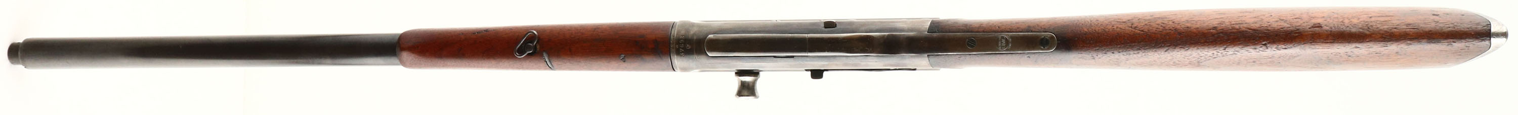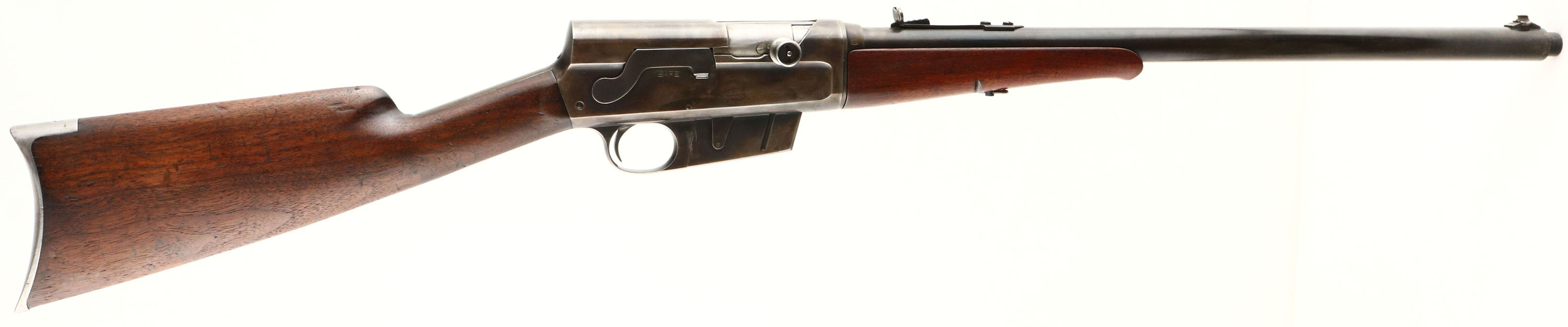 Remington, Model 8, .30 Rem Cal, MFG. 1916, SN: 37693, Semi-Auto Rifle, 22'' barrel. The original straight grip & schnabel forend stocks are very good & solid. Then stock appears to have been sanded & reoiled some time ago & has developed a nice aged tone. There are several small areas on the stock that have fill add back when it was sanded to fill larger contusions. The metal is slightly proud to the wood on the stock. The forearm has been sanded more recently & carries a thin layer of finish. There remains several small to large scuffs, scratches & contusions to the wood, along with a small 1/4'' stress crack emanating from the upper tang. The original metal blue finish has mostly worn away, with some remains on the barrel. The barrel & receiver have a layer of cold blue add which gives it a spotty & thin brown color. Spotty pitting & rust speckling are found on both the barrel & left side of the receiver. Bore is very good, bright & clean. The barrel carries standard front & rear sights. Stock carries the Remington UMC upper tang crescent metal buttplate polished silver. 5 round fixed magazine. Tight action. Would like make a good hunting rifle or shooter. FFL or C&R Req. - Value: 400 to 600