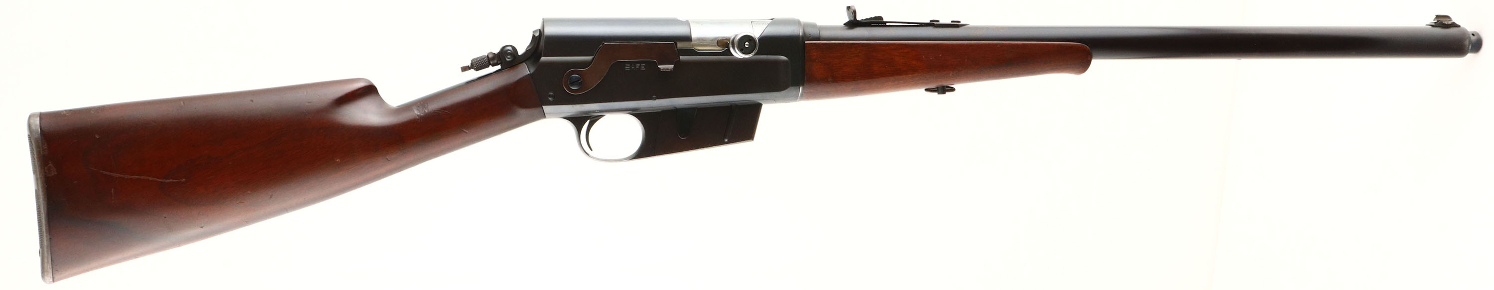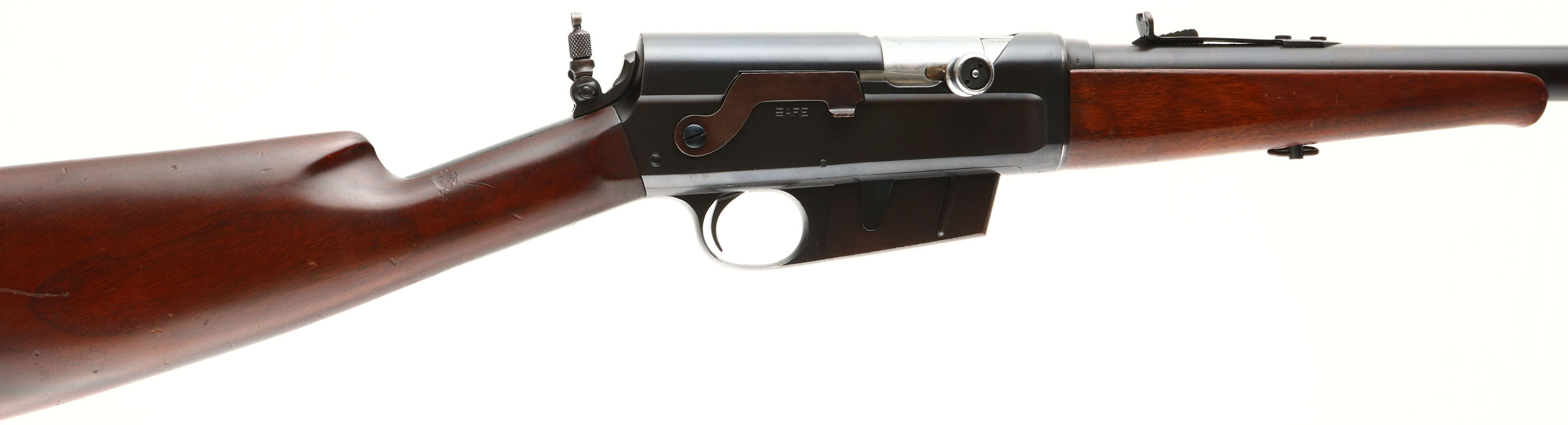 Remington, Model 8, .35 Rem Cal, MFG. 1916, SN: 38092, Semi-Auto Rifle, 22'' barrel. The original straight grip & schnabel forend stocks are very good to excellent. The stock has been cleaned or possibly lightly sanded, & refinished. The forearm carries the original finish, with a thin added layer of finish. There are several minor to small scuffs, scratches & contusions to the wood & finish. The original metal blue finish rates 80% overall, with the finish on the mag & safety lever toning a plum/brown. Bore is excellent. The receiver carries a Lyman tang sight, while the barrel carries a standard adjustable rear sight & Marble Sheard elongated blade front sight. Stock carries the rarely found checkered reverse teardrop Remington UMC metal buttplate. 4 round fixed magazine. Tight action. An excellent looking & nicely configured rifle. FFL or C&R Req. - Value: 600 to 1000