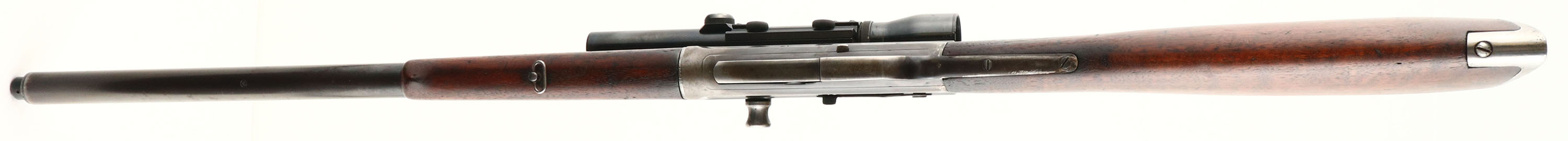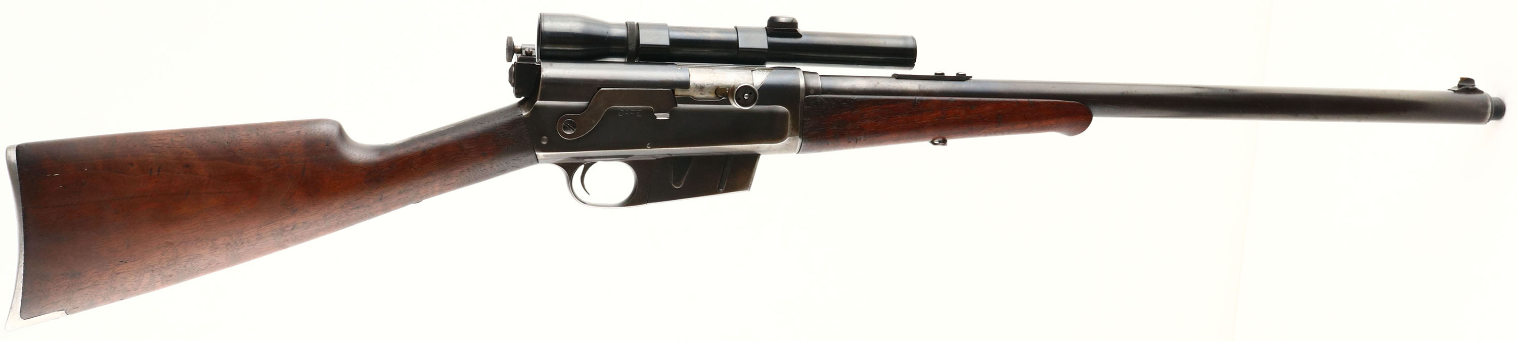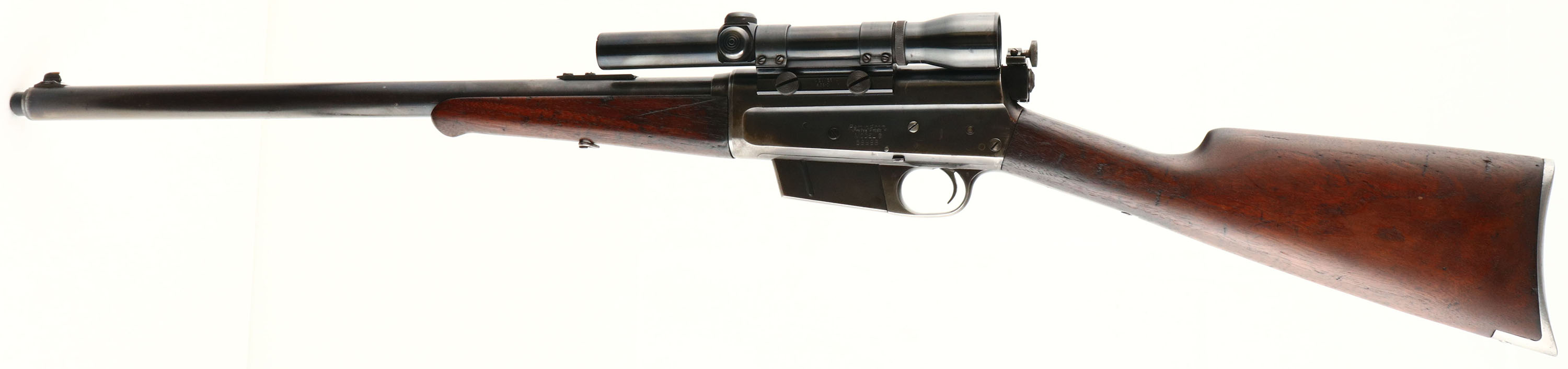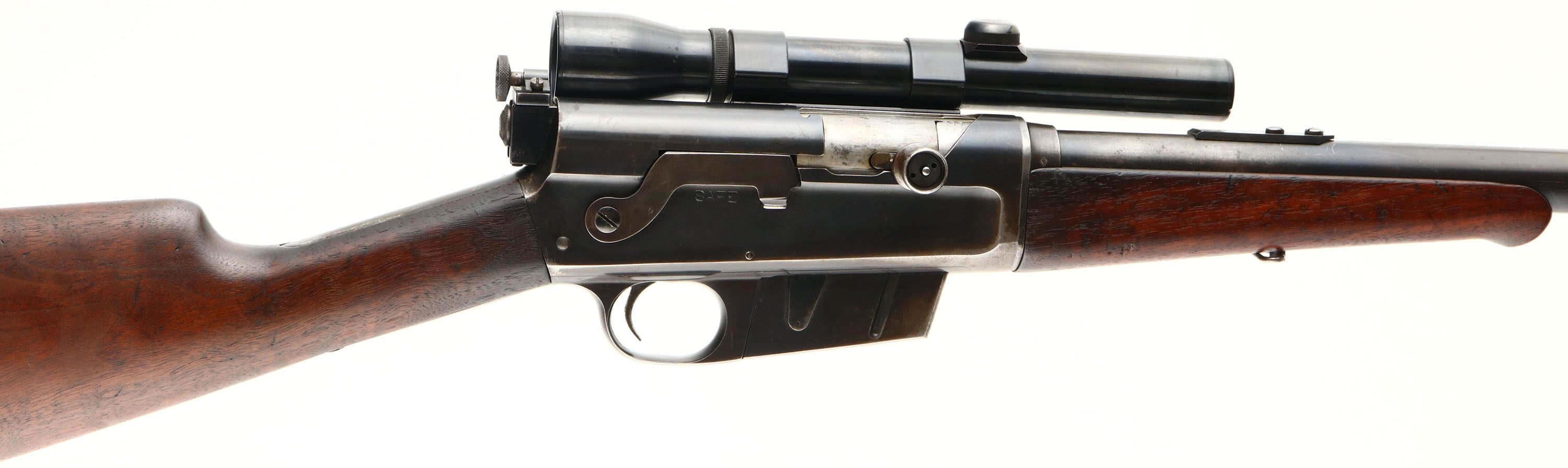 Remington, Model 8, .300 SAV Cal, MFG. 1929, SN: 58998, Semi-Auto Rifle, 22'' barrel. It is likely this rifle began life as a 35 REM caliber rifle. In 1936 Remington felt the model 8 needed a facelift & introduced the model 81, which was little more than a minor cosmetically changed model 8. A few short years later, in 1940, Remington released the model 81 in 300 Savage caliber. This caliber proved very popular amongst many big game hunters. As a result, some model 8 owners chose to return their rifles to the factory to have them swapped to 300 Savage. This was done with very little modification or adjustment to the rifle other than swapping the barrel for a 300 SAV barrel. The left side of the barrel shroud would have been stamped with a repair/upgrade code, which this rifle has, ''AUU3''. The original straight grip & schnabel forend stocks are very good. The stocks carry the original finish, but the forearm carries a thin added layer of finish due probably to much previous wear. The stocks have darkened some from oils & use. There are several minor to small scuffs, scratches & contusions to the wood & finish. The original metal blue finish rates 60% overall, with most of the finish wear to the carry points of the front of the mag, belly of the receiver & back portion of the barrel. There are several small nicks or abrasions to the back edges of the receiver & tangs. Bore is excellent. The receiver carries both a Redfield receiver tang sight & a vintage period scope on Weaver rings & Weaver quick detachable mount. The barrel carries a Marbles rear base & a Marble Sheard elongated front sight. Stock carries the bottom tang Remington UMC crescent metal buttplate, which has worn or been polished silver. 4 round fixed magazine. Tight action. A uniquely configured model 8 hunting rifle. FFL or C&R Req. - Value: 600 to 1000