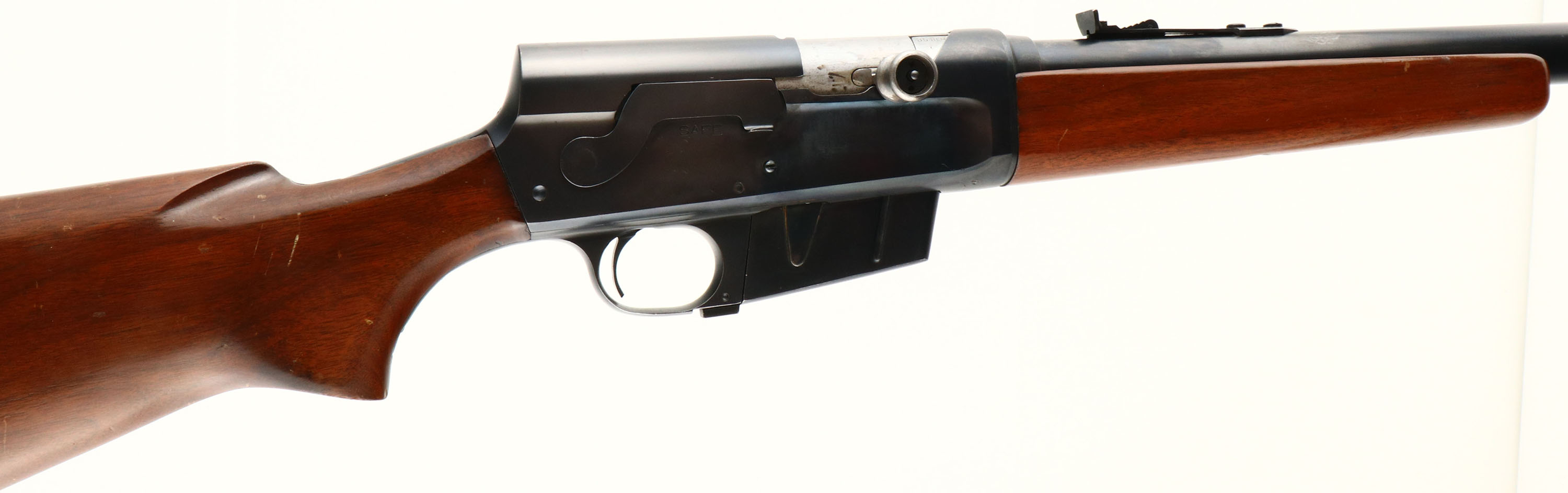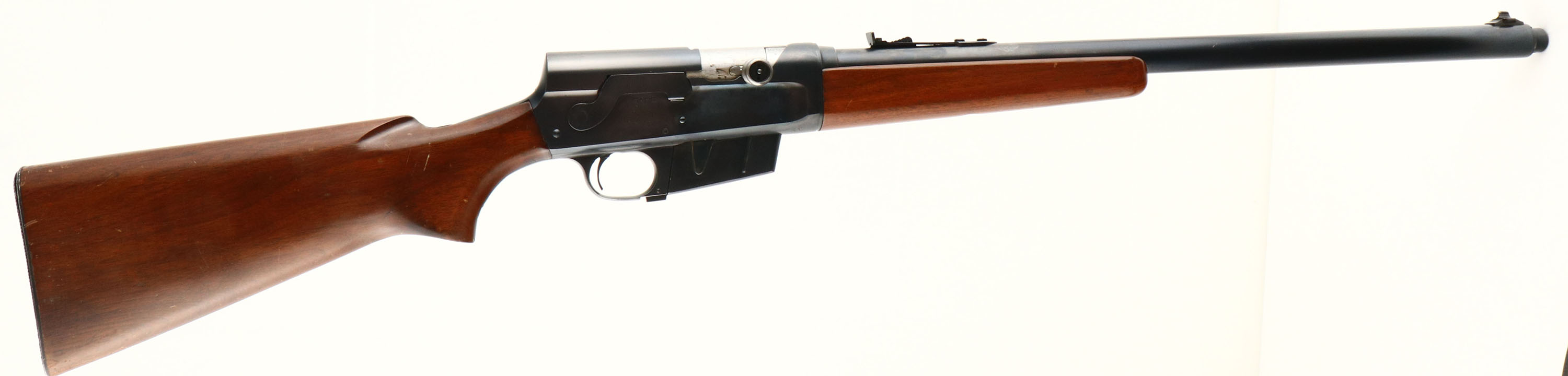 UNIQUE Remington, Model 81 KRIEGER (Modified detachable clip), marked .35 Rem Cal., MFG. 1949, SN: 50262, Semi-auto take-down rifle, 22'' barrel, One of the features hunters & shooters often hoped from Remington was a detachable magazine rather than the standard fixed mag. Remington never offered this feature in the model 8 or 81& thus many a gunsmith or garage fiddler attempted a conversion. Most were little more than butcher jobs that often compromised functionality. There are a few exceptions however, & the most notable is the work of R. Krieger & Sons of Mt. Clemens, Michigan. Their conversions were done using the rifles existing 4/5 round box magazine. What sets a Krieger apart from all other conversions is the outstanding quality of the machine work, an almost factory appearance. Krieger & Sons also had a gunsmiths working knowledge of the 8/81 action & knew the necessary alterations to ensure safe, reliable operation. It is not known how many of these conversions were performed, but we do know they were done in the late 1940s & early 1950s. Originally conversions were priced at $20. In 1951 Kriegers were advertised in NRAs American Rifleman, with conversions costing $25 & $12.50 per extra magazine. A Krieger is one of the few modification to an original factory rifle that does not typically detract from its value, rather most Krieger rifles demand a premium in todays collecting environment. On this rifle, the original factory flat grip wood stock & forearm are excellent, with several minor scuffs, scratches & contusions to the excellent finish. The upper corners of the wrist on each side have small slivers/chips of missing wood. The original metal blue finish rates 90% overall. However, there is a 1''X2'' area under the bolt handle on the right side of the receiver that once had a name or number etched into the metal. That has been removed or polished away & a cold blue finish has been used to try & cover the area. The barrel carries an adjustable rear & blade front sights. Stock carries the original checkered metal buttplate. Bore is excellent. 4 shot detachable magazine. A quality & very nice looking Krieger 81 rifle in the popular hunting caliber of 35 Rem. FFL or C&R Req. - Value: 1200 to 1800