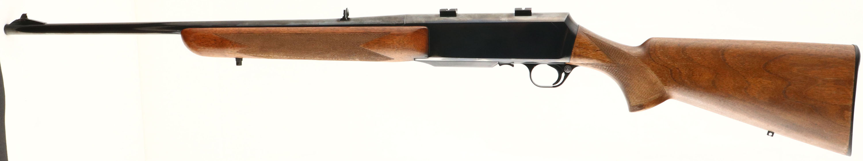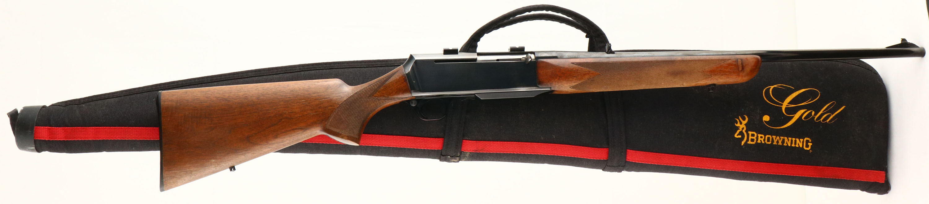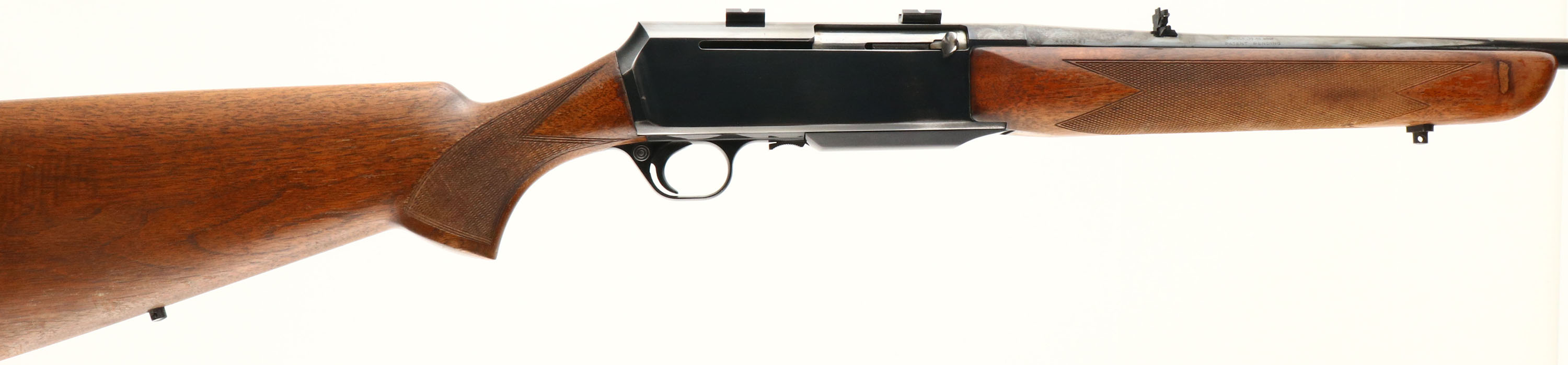 Browning, Model BAR, .30-06 Cal., MFG. 1967, SN: 4479M7, Belgium, Semi Auto Rifle, 22'' Round barrel, ''Patent Pending'' stamped on barrel, as it is an early 2nd year of production example. The factory checkered & flat knob pistol grip walnut stocks are very good, but the factory high gloss finish is worn & thinned to about 50% remaining. There are several small scuffs, scratches & contusions. The checkering remains very good. The original high polish metal blue finish retained at 90% on the barrel, with a handful of small warn spots top of mid barrel. The blue rates 80% on receiver, with areas of loss found primarily on the forward belly of the receiver. Bore is excellent, The top of the receiver is factory drilled & tapped & carries scope mount blocks. The barrel carries a folding leaf rear sight & standard ramped blade front sight. Hinged floorplate, with detachable box mag. The stock carries a Browning plastic buttplate & sling stud provisions. Comes in a period correct ''Browning Gold'' zipper case. A very good & popular hunting rifle & caliber. FFL & C&R Req. - Value: 400 to 800