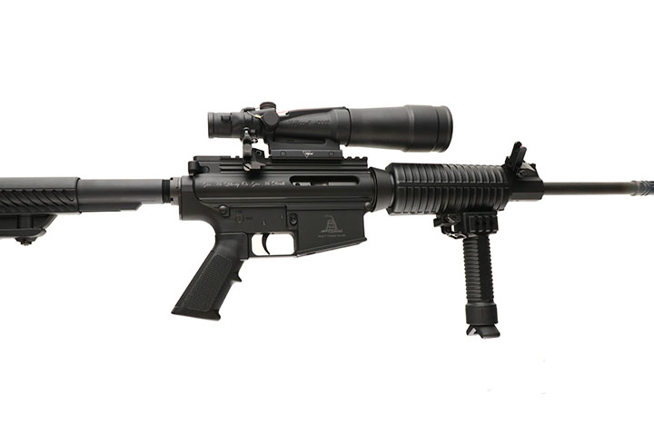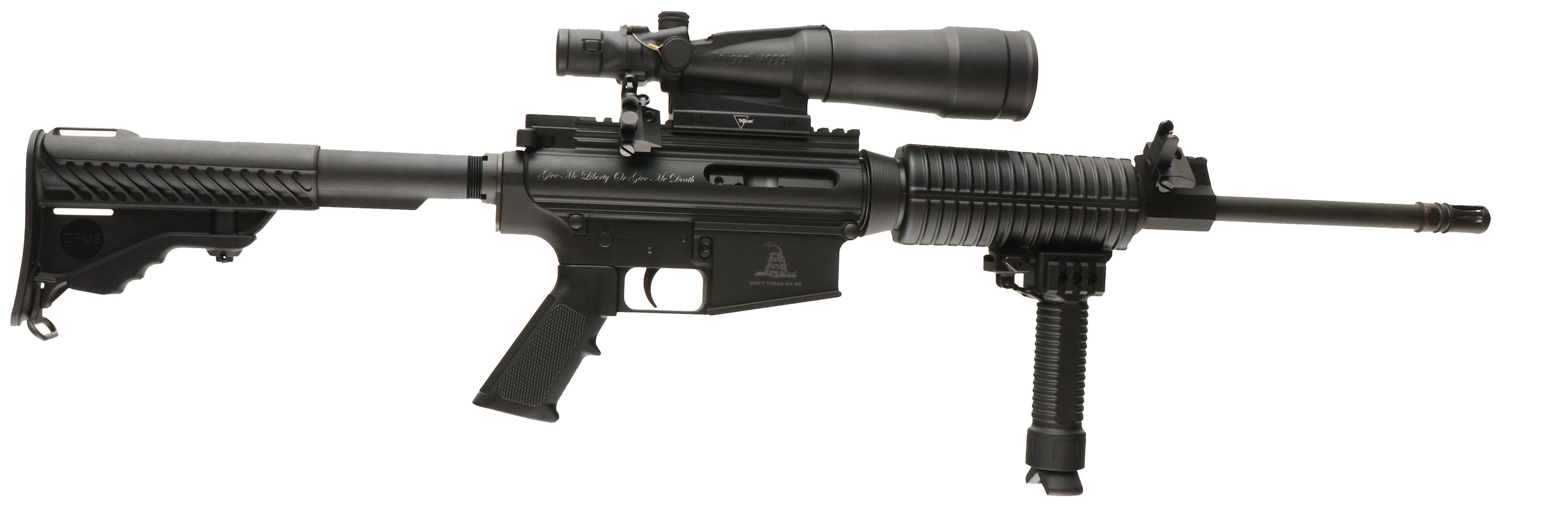 DPMS Panther Arms, Model LR-308 Special Edition, CAL: 308, MFG: Modern, SN: 60885, Semi Auto Pistol, 16 1/4'' heavy profile barrel, 17 3/4'' with brake. 1 n 10'' twist rate. The synthetic DPMS Classic 6 position adjustable black stock & DPMS Custom Over molded black grip are excellent. The hard coat anodized black finish rates 99% overall excellent. The upper is engraved ''Give Me Liberty Or Give Me Death'' while the right side of the mag box carries a printed rattle snake & the words ''Don't Tread on Me''. Bore is excellent. The full length picatinny rail on receiver carries a Trijicon 5.5X50 ACOG scope, with cover, on Trijicon base. Scope alone retails for $1600. Receiver rail & forward small rail carry UUQ 45 degree offset flip-up aperture rear & red fiber optic bead front sights. The forend also carries a post foregrip, with retractable bi-pod. Sling loop provisions. No mag. FFL Req. - Value: 1500 to 2500