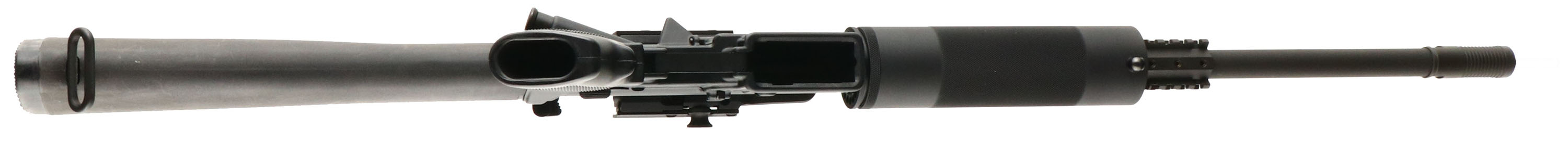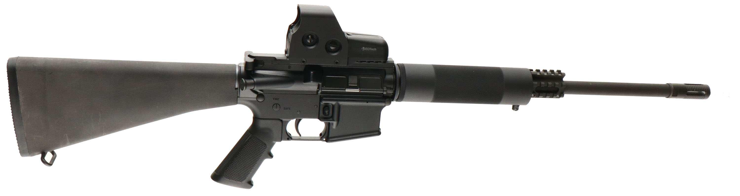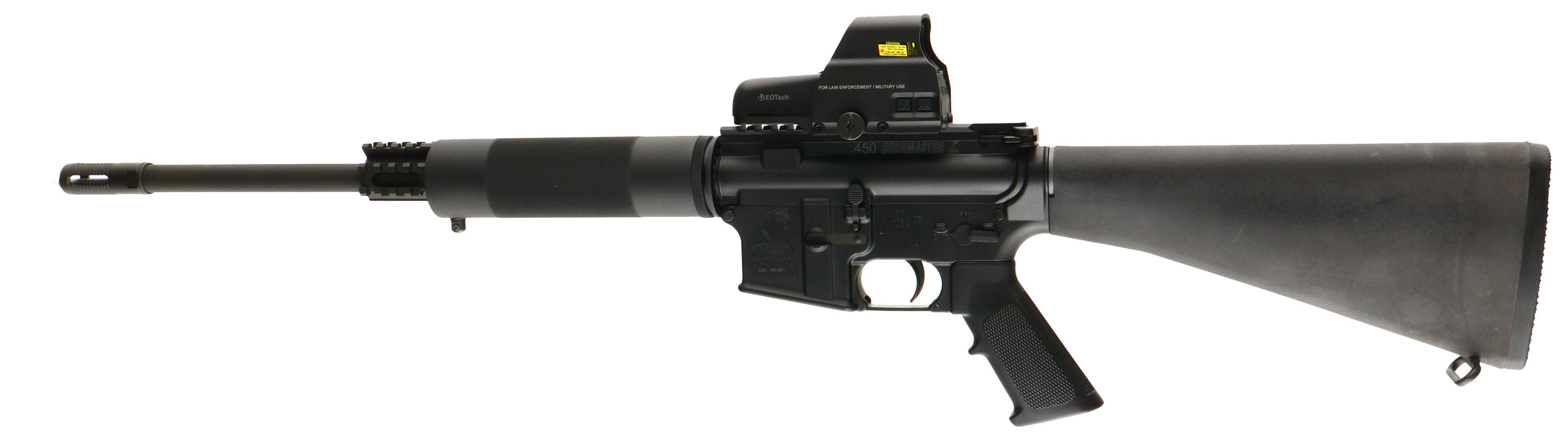 Bushmaster, Model XM-15-E2S, CAL: 450 Bushmaster BFI MFG: Modern, SN: BFI 535941, Semi Auto, 16'' M4 barrel, 18'' when including the muzzle brake. Upgraded with a fixed M16 A2 composite stock with buttplate storage compartment access. Also upgraded with a 7 1/2'' steel finely checker textured barrel forend. Both stock & forend are excellent. The original metal black finishes rate the full 100%. The receiver carries an elevated picatinny rail, while in front of the forend is a tri-rail picatinny rail fixture. The receiver rail carries a 500 series L3 EOTECH HWS holographic sight, functions properly but needs new batteries. Excellent bore. Upgraded muzzle brake. Sling stud & loop. No mag. Overall excellent. FFL Req. - Value: 600 to 1200