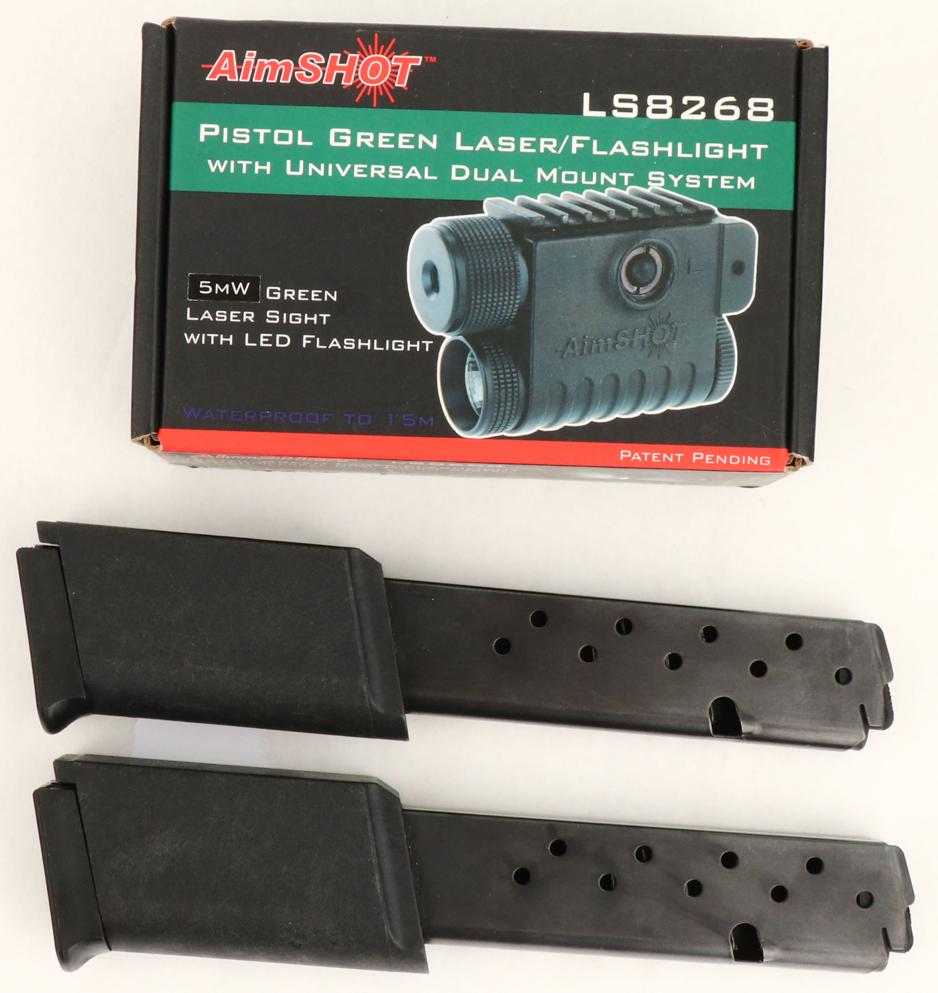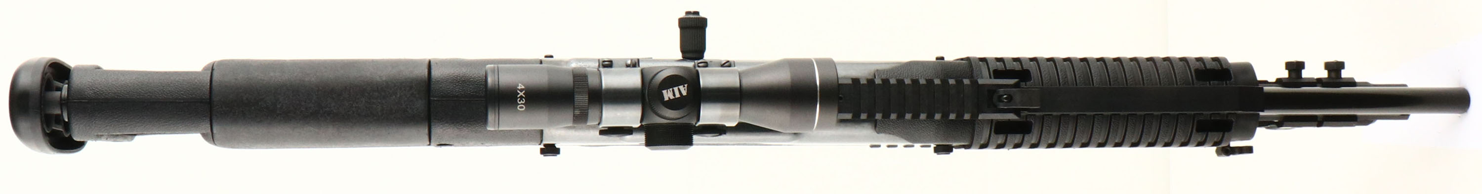 Hi-Point, Model 995, 9mm Cal., MFG: Modern, American-made firearm. SN: E76903, Semi auto rifle, 16.5'' barrel, The black all-weather molded polymer skeletonized stock & pistol grip are excellent. The original black metal finish rates 95%, with some light speckling. Bore is excellent, The receiver 10'' picatinny rail is mounted with an Aim 4X30 scope on Weaver mounts, while the front rail carries an AimShot LS8268 Green laser/flashlight, LOP adjustable buttplate/pad. Grip-mounted mag release. Comes with three mags, one flush mount, two extended. Sling swivels. Comes with the original AimShot flashlight box. A compact & rapid fire rifle. FFL Req. - Value: 300 to 500