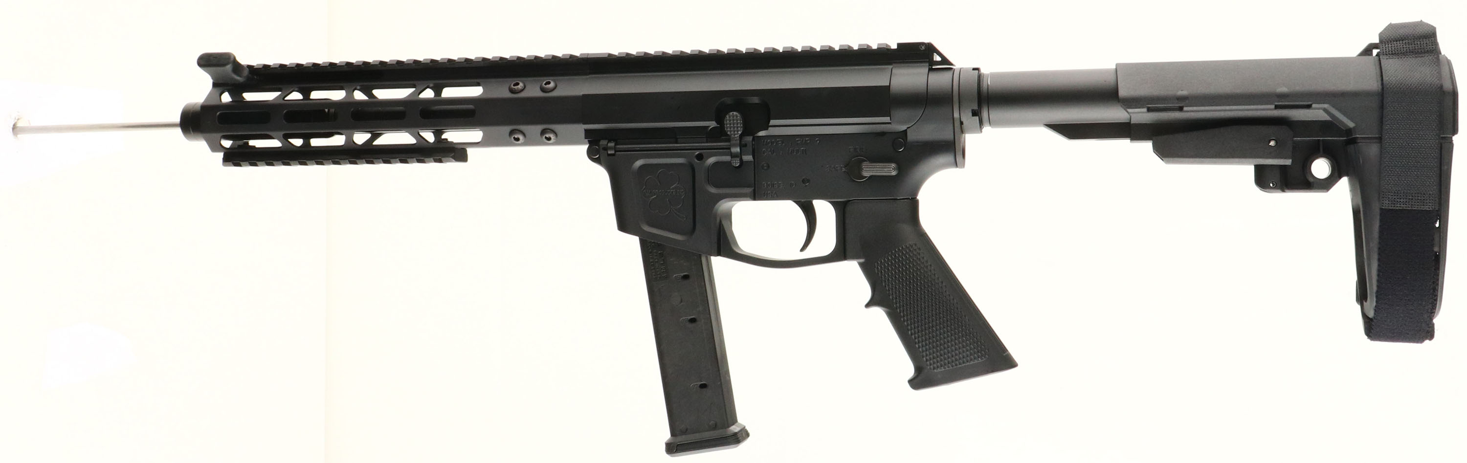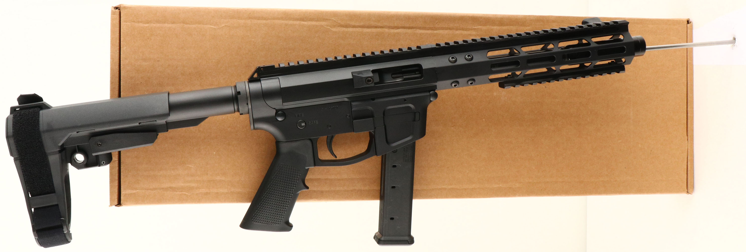 BOXED, F.M. Products INC, Model FMP-9, CAL: 9X19mm, MFG: Modern, SN: 9-19717, Semi Auto Pistol, 10'' barrel, 1:10'' twist rifling. The textured pistol grip & SB Tactical SBA3 slide adjustable pistol brace/stock are excellent. The metal finishes on the billet upper, lower & 8 1/4'' M-lok handguard are all excellent. HK MP5/G3 style forward charging handle. Bore is excellent. Has full length upper picatinny rail for optics or accessories. Comes with a PMAG 27 GL9 detachable mag. Comes in original shipping box with owner's manual, packaging & sticker. FFL Req. - Value: 600 to 1000