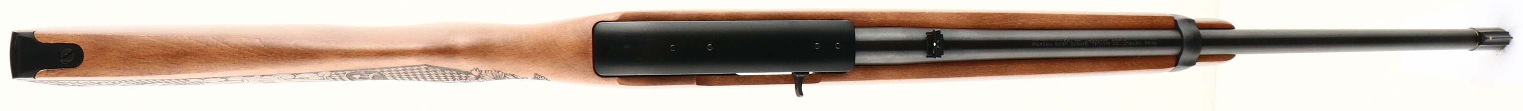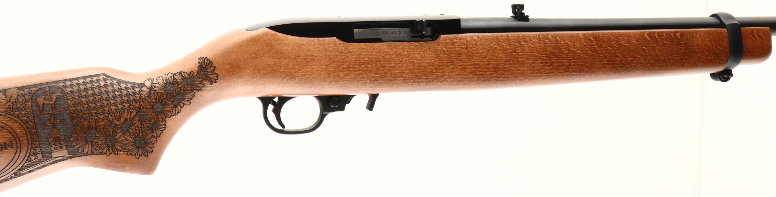 BOXED Ruger, Model 10/22 Carbine, RUGER & ORION EDITION CAL: 22 LR, MFG: 2023, SN: 0023-09410, Semi Auto Rifle, 18 1/2'' barrel. Marked 167 of 300. The factory flat pistol grip wood stock is excellent, with no handling marks to the original finish. The stock has a beautiful race horse & floral scene laser engraved on the right side. The original metal blue finish rates 99%+. Bore is excellent. The barrel holds a standard folding leaf rear sight & blade front sight. Stock carries a smooth plastic carbine buttplate. Detachable mag. Comes in the original box, with paperwork, lock & scope mounting bar. FFL Req. - Value: 300 to 500