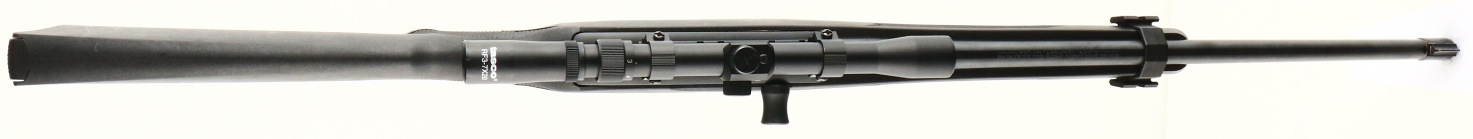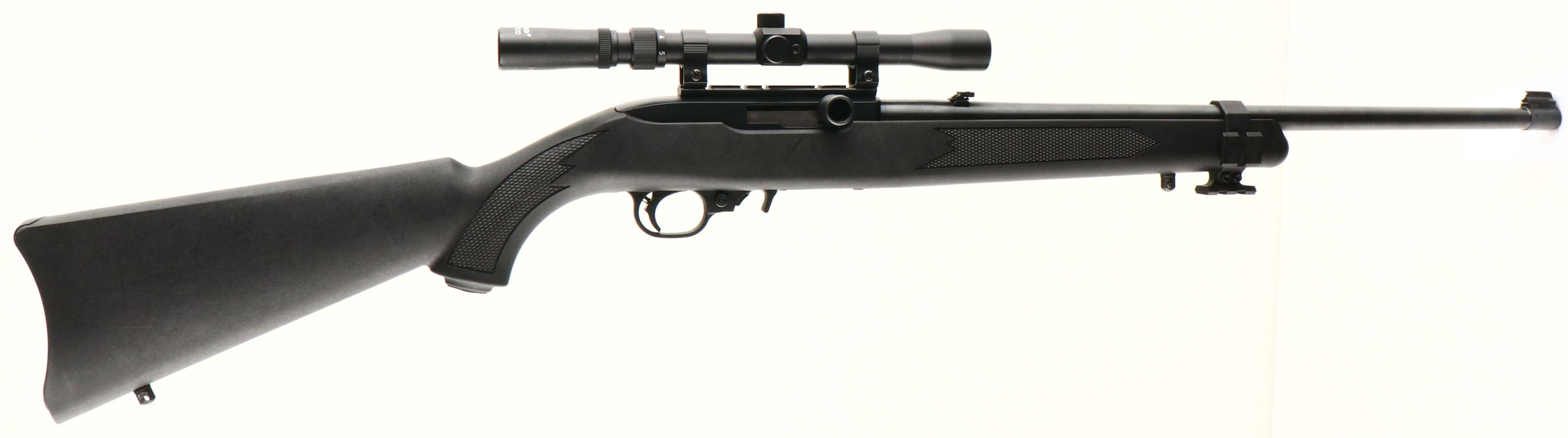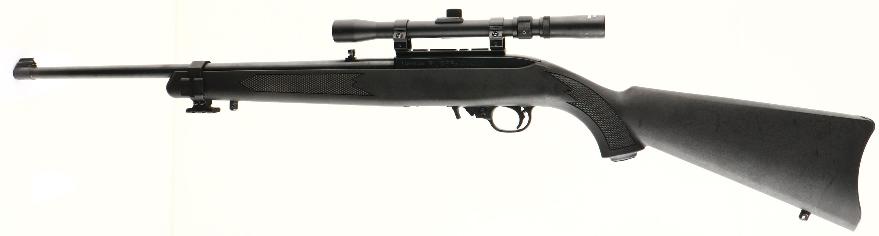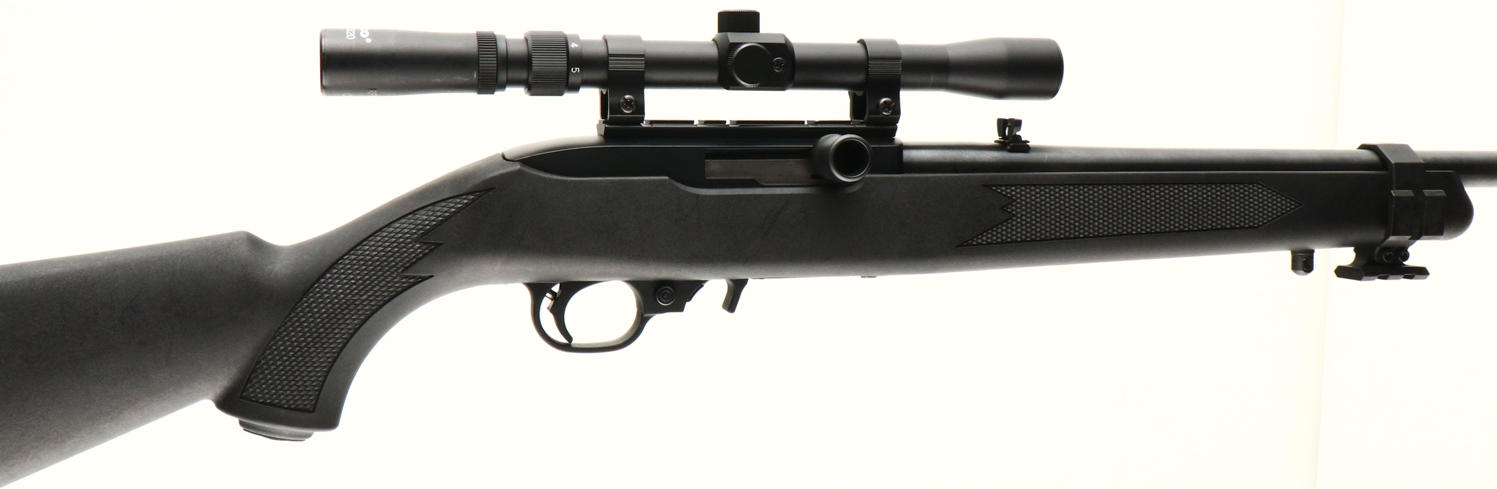 Ruger, Model 10/22 Carbine, Marked .22 Long Rifle Cal., MFG. Modern, SN: 358-69189, Semi-Auto Rifle, 18 1/2'' round barrel, The original checkered & capped pistol grip synthetic black stock is excellent, with very few minor rubs. The original metal finishes rate 97% overall. Bore is excellent, Receiver mounted with a Tasco RF3-7X20 scope, while the barrel holds the factory folding leaf rear sight & standard blade front sight. Forend tip carries small picatinny rails for accessory mounting on both sides & the belly the stock. Factory checkered plastic buttplate. Sling studs. Cocking handle has been upgraded. Detachable mag. FFL Req. - Value: 150 to 300