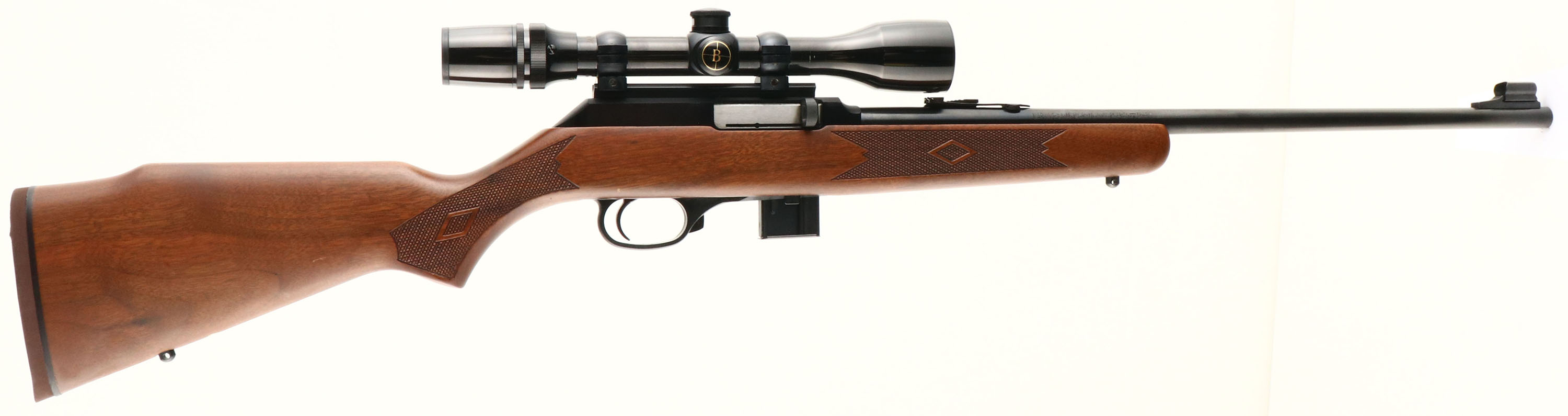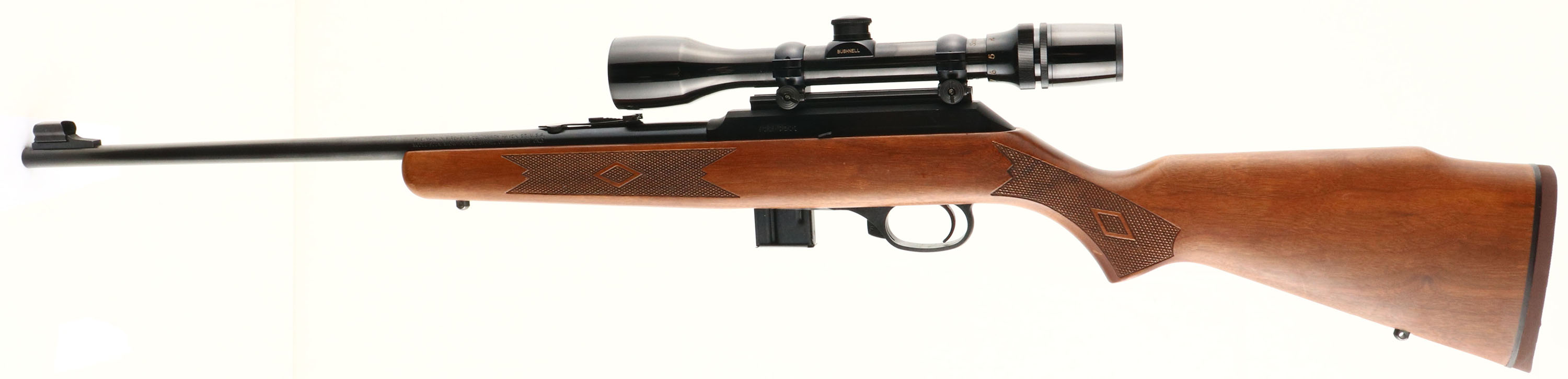 The Marlin Firearms Co. Model 922M, CAL: 22 WMRF, MFG: 1990's, SN: 922M0211, Semi Auto Rifle, 20 1/2'' barrel. The original checkered & flat pistol grip wood stock is excellent, with a couple of light surface rubs or dings to the original finish. The metal blue finish rates 99% overall. The micro-groove bore is excellent. The receiver mounted with a Bushnell ScopeChief VI 3-9x, while the barrel has a folding leaf rear & hooded blade front sights. Buttstock carries a Marlin marked, solid rubber recoil pad. Sling studs. The Marlin bullseye trademark is located on the belly of the stock. Detachable magazine. FFL Req - Value: 300 to 600