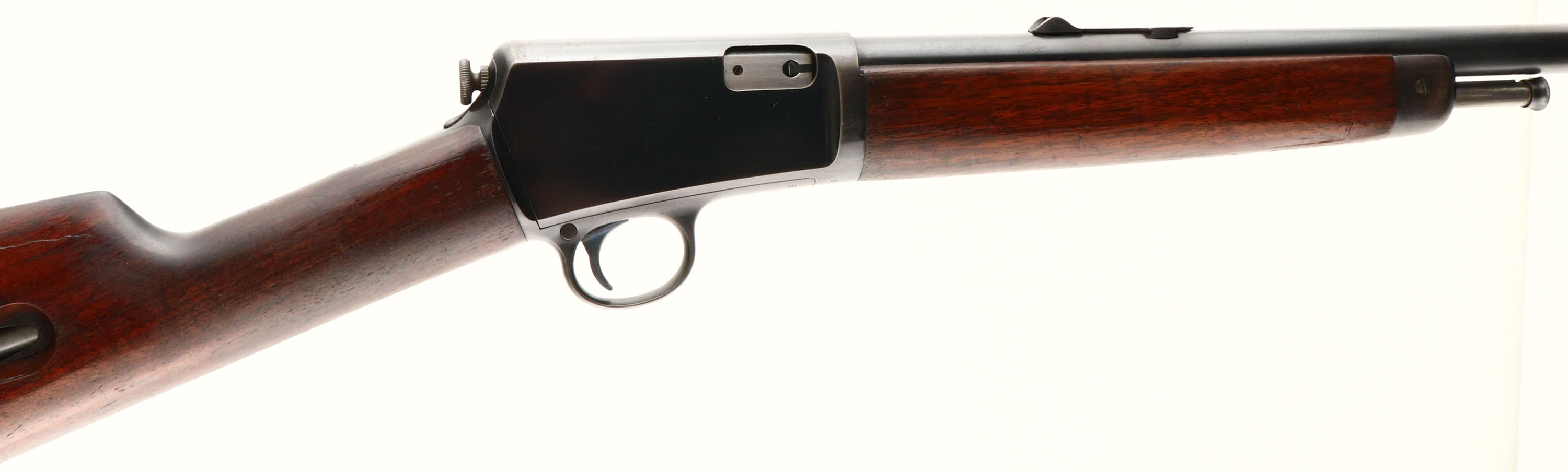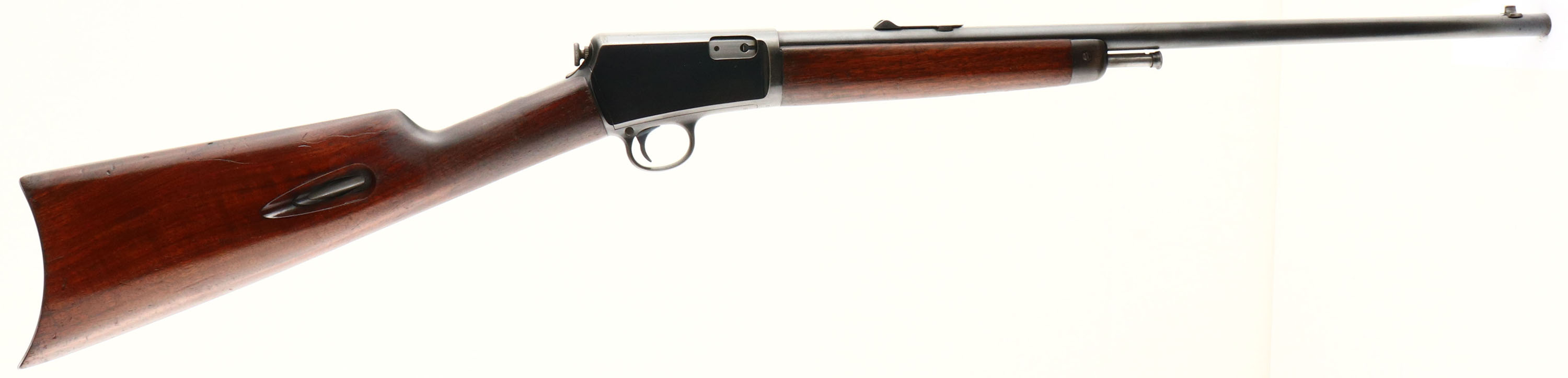Winchester, Model 03, Marked .22 Cal. Automatic (.22 WIN Auto), MFG. 1908, SN: 51019, Semi-Auto Action Rifle, 20'' round barrel. 10 shot tubular mag in the stock. The original wood stocks are excellent & solid, carrying the original factory finish. The finish has thinned from use at the wrist & forearm. There are a number of minor scuffs & contusions, with one larger 2 1/2'' drag abrasion on the left side of stock.. The original metal blue finish is 90% on the barrel & 80% on the receiver. Bore is excellent. Rifle carries original front & rear sights. Original buttplate. A very nice looking & original early example. FFL or C&R Req. - Value: 800 to 1500
