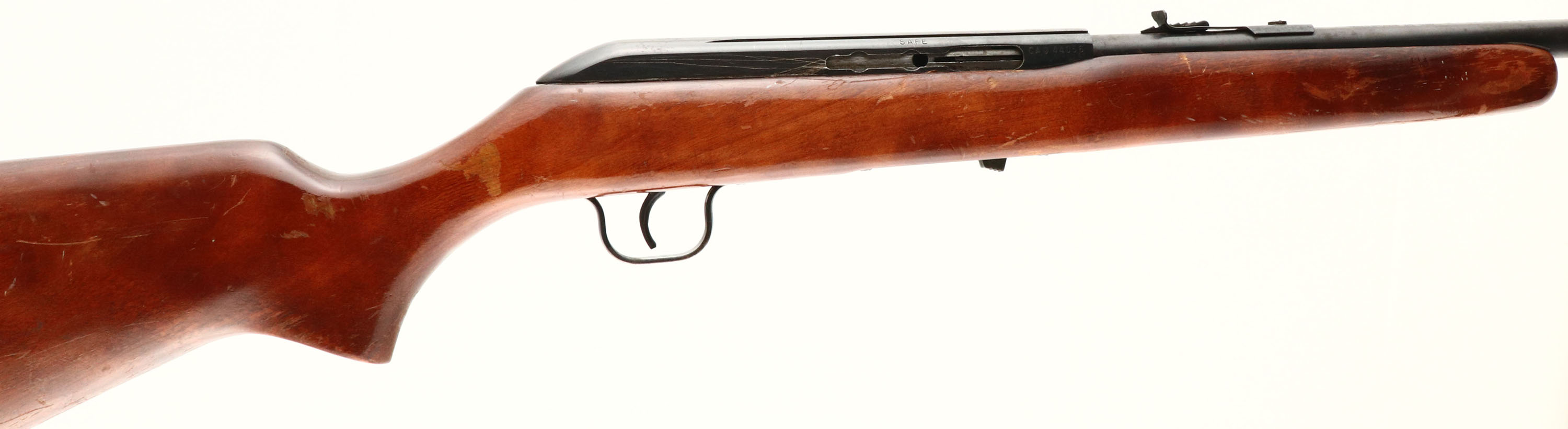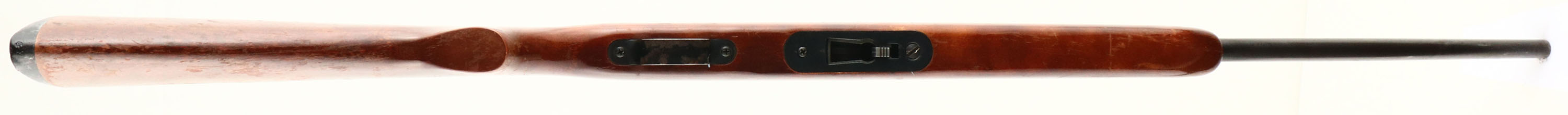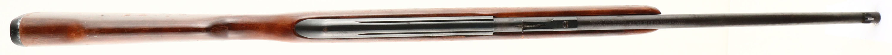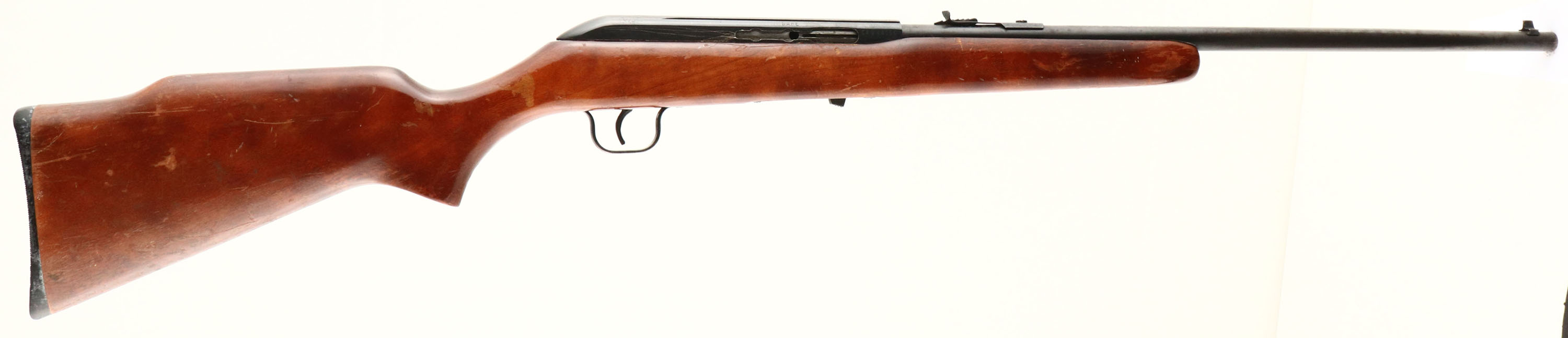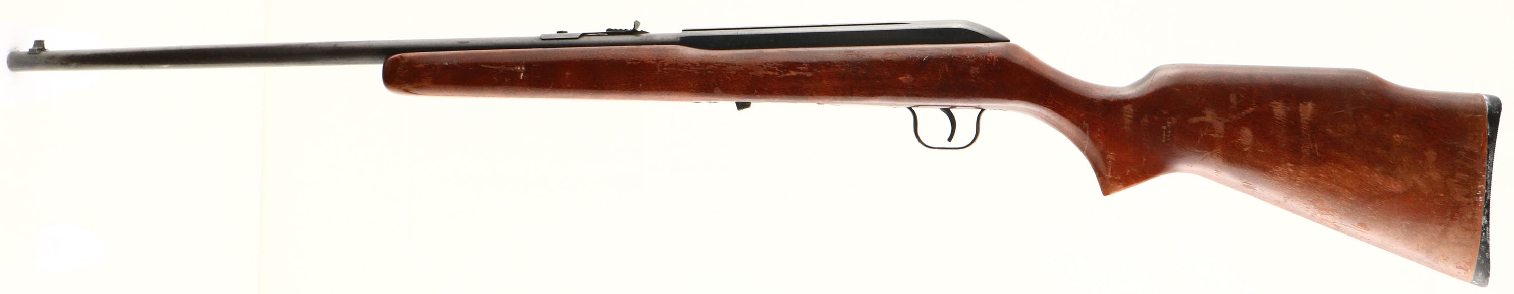 Cooey, (By Winchester), Model 64B, Marked .22 LR Cal., MFG. 1964-70, SN: None, Tubular Mag Semi-Auto Rifle, 20 1/8'' round barrel. Production for the model 64 began in 1964 after Olin Mathieson Chemical Corp., under the Winchester-Western division, acquired in 1961 the Canadian Cooey Machine & Arms Co. The original flat pistol grip wood stock is good, but with numerous scratches, scrapes & contusions to the flaking original finish. The original metal blue finish rates 70% overall, with rust speckling & pitting. The rifle is missing the bolt charging handle & there are several scratches on the right side of the receiver where other items were used to try & cock the bolt. Bore is good. Factory front & rear sights. Factory Winchester plastic buttplate. Missing the detachable mag. The rifle appears to function, but due to the missing parts as mentioned, this rifle is being sold ''AS-IS'', with no returns. A rarely encountered Cooey/Winchester semi-auto .22. FFL or C&R Req. - Value: 50 to 100