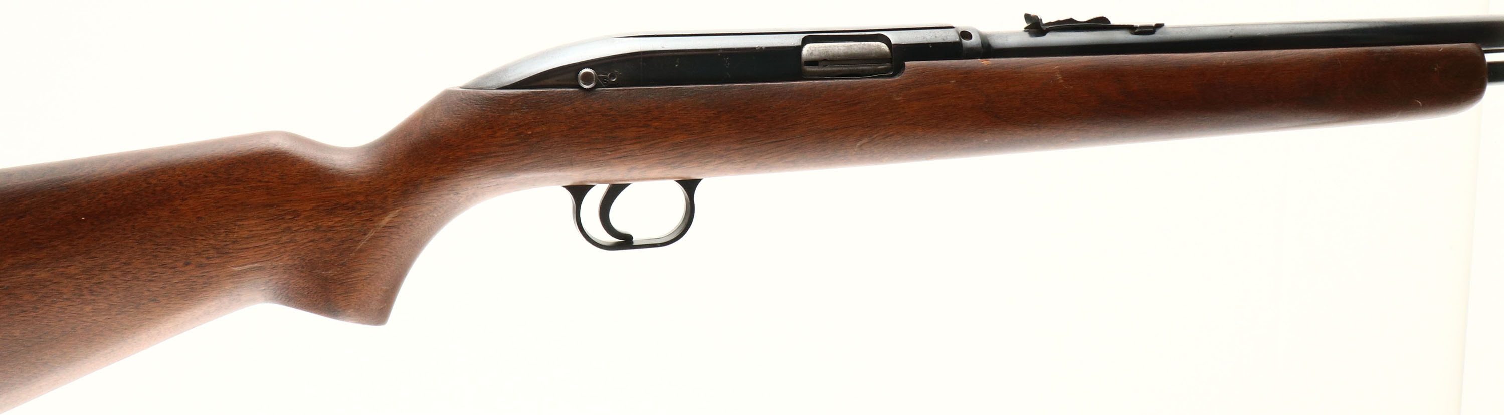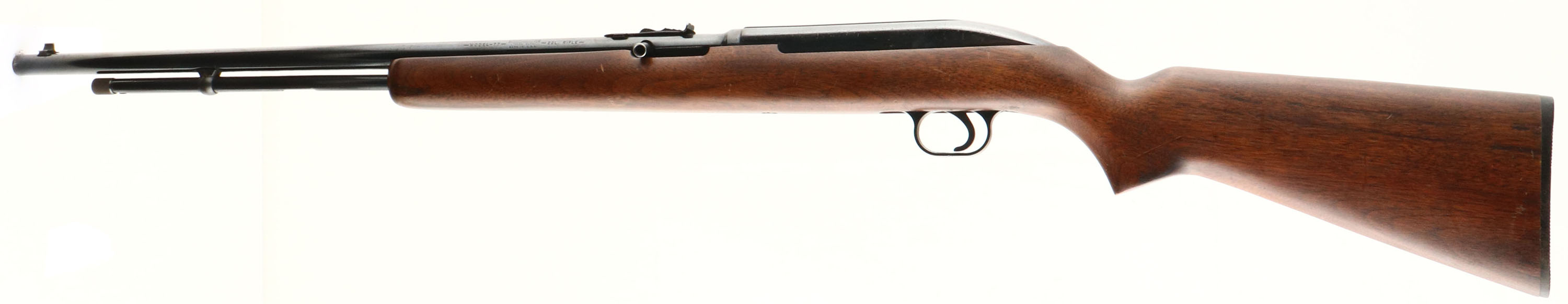 Winchester, Model 77, Marked .22 L. RIFLE Cal., MFG. 1955-62, SN: None, Tubular Mag Semi-Auto Rifle, 22'' round barrel. The original flat pistol grip wood stock is excellent, with several minor scratches & light contusions to the original finish. The original metal blue finish rates 85% on the barrel, 70% on the receiver, with some haze & speckling. Bore is excellent. Factory front & rear sights. Factory plastic buttplate. A nice Winchester semi- Auto .22. FFL or C&R Req. - Value: 200 to 400