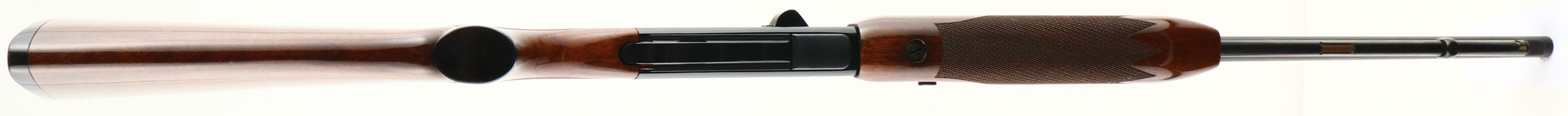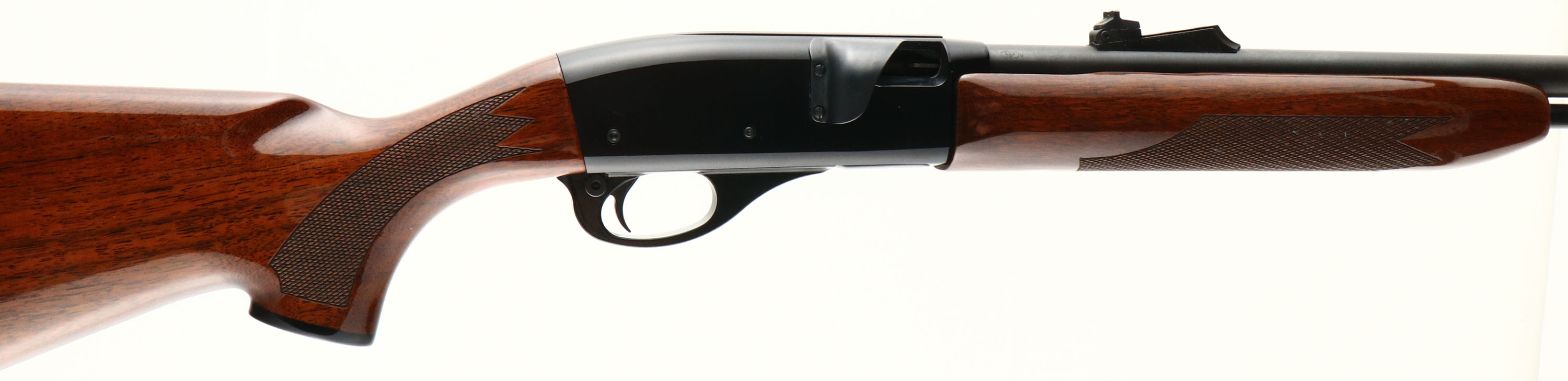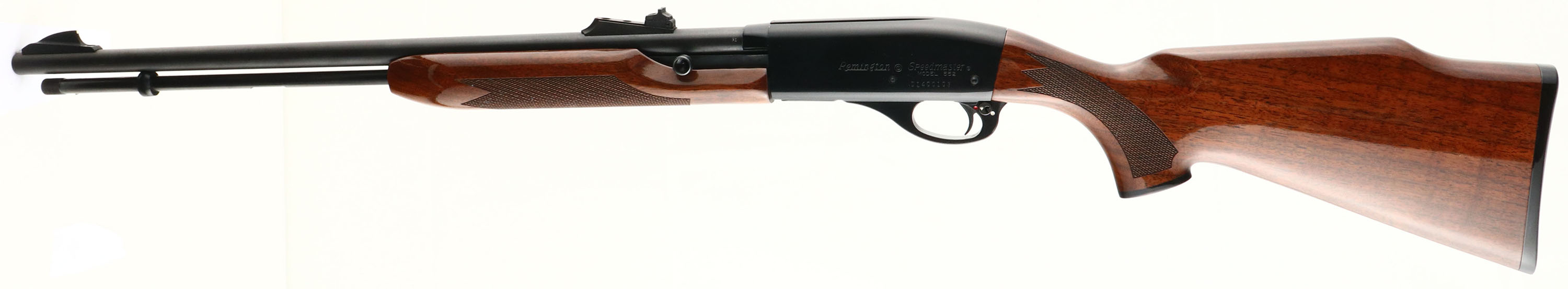 Remington, Model 552 Speedmaster, CAL: .22 S.L.LR, MFG: 1975, SN: D1400103, Semi Auto Rifle, 21 1/2'' barrel. The original checkered & capped pistol grip wood stock is excellent, with very few tiny handling marks to the excellent original high gloss finish. The metal black finish on the aluminum receiver rates 95%. The metal blue finish on the barrel & tube rates 95%. Bore is excellent. The barrel has the standard front & rear sights. Buttstock carries a Remington checkered black plastic buttplate. Shell deflector. FFL Req. - Value: 250 to 450