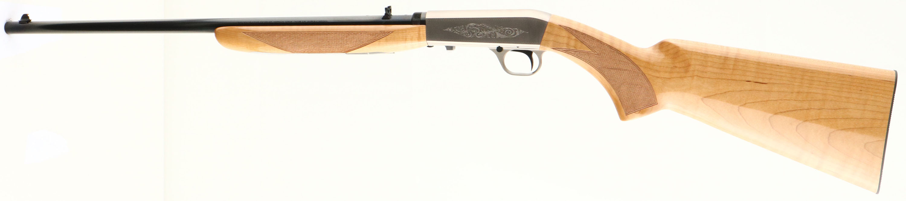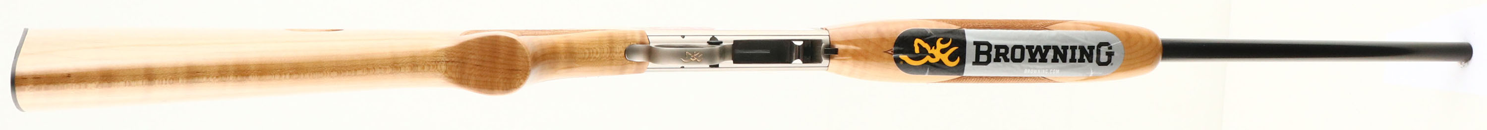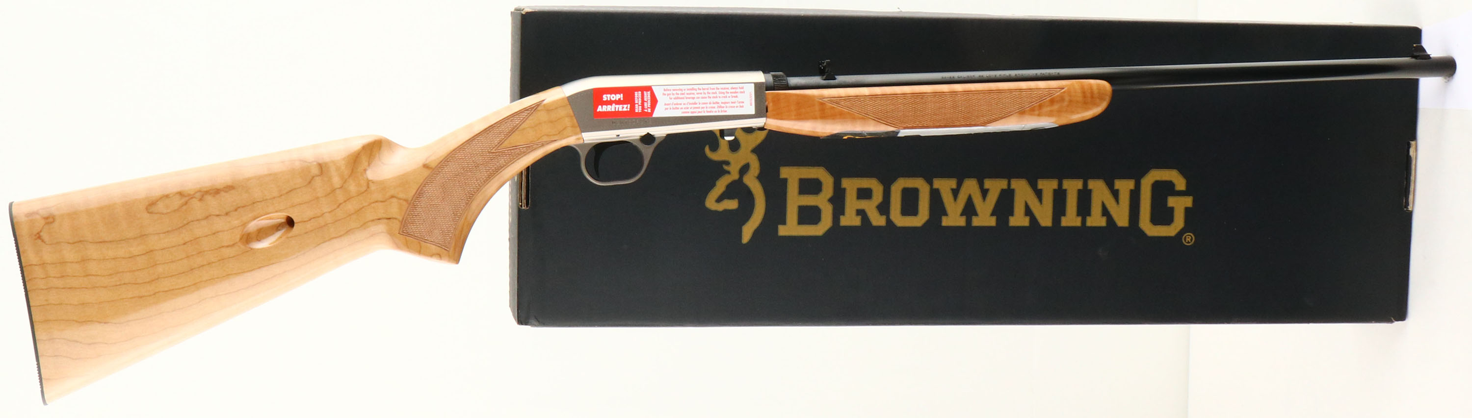 BOXED Browning (Japan) Model SA-22 MAPLE, CAL: 22 L.R, MFG: 2018, SN:02076ZP212, Semi Auto Rifle, 19 3/8'' round barrel. The original checkered & flat pistol grip deluxe AAA maple stocks are excellent, displaying no defects to the high-gloss original finish. Checkering cut at 20LPI. The metal blue finish is 100% on the barrel, while the satin silver receiver is excellent. The receiver scroll & border engraving. Bore is mint. The barrel is fitted with factory folding rear sight & large blade style front sight. Metal buttplate. The receiver & forend still carry the retail & warning stickers. Comes in a correctly labeled box, with lock & brochure. Essentially a New Old Stock Rifle. FFL Req - Value: 800 to 1000