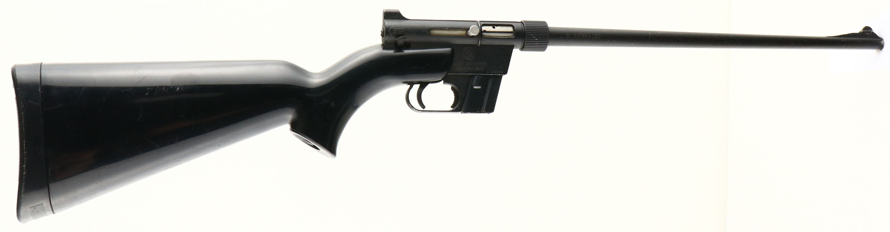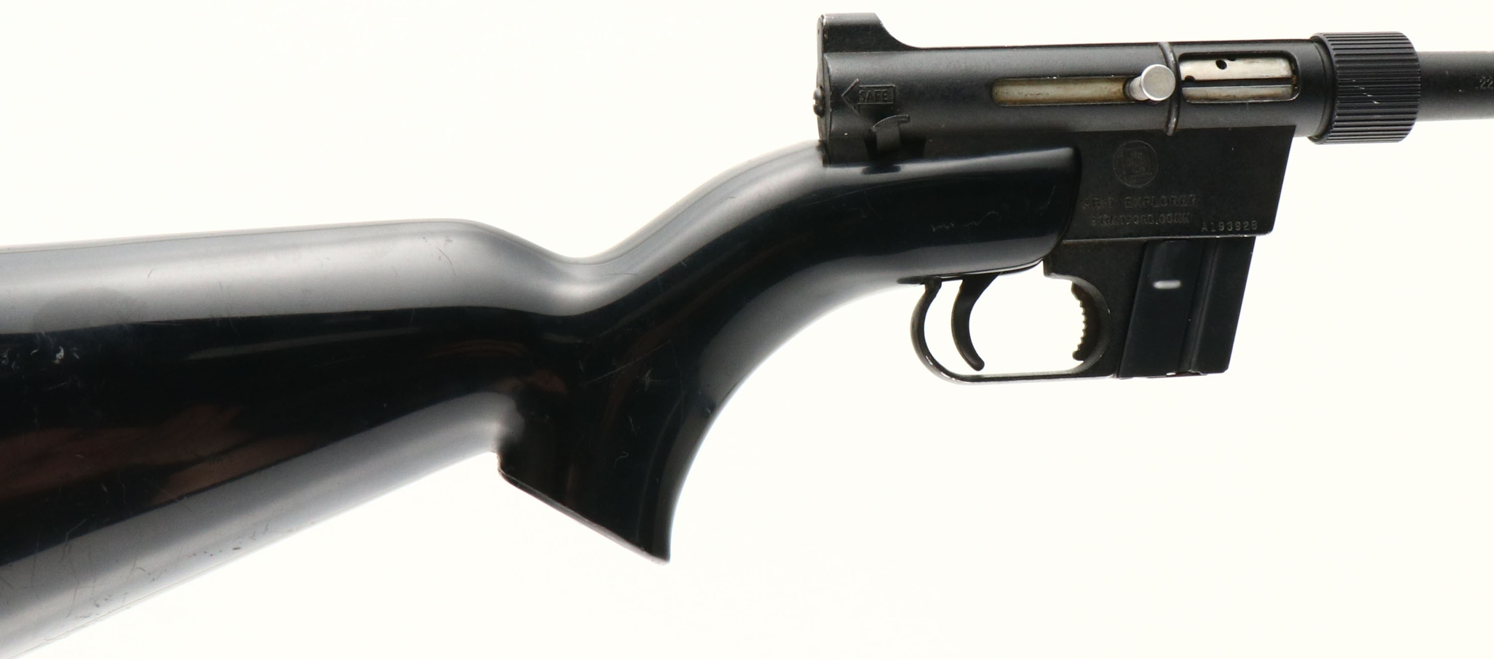 Charter Arms, Model AR-7 Explorer, CAL: .22 LR, MFG: 1973-95, SN: A193928, Semi-Auto Rifle, 16'' detachable barrel. The factory flat pistol grip, black synthetic stock is very good, with numerous minor to small scuffs or scratches. The original metal blue finish rates 85% on barrel, mag & receiver, which can all be dismantled & stored in the buttend of the stock. Bore is very good. Factory sights. Stock carries a black plastic buttplate or cap, which is removable to access the parts storage compartments. A great little backpack or survival rifle. FFL or C&R Req. - Value: 150 to 250