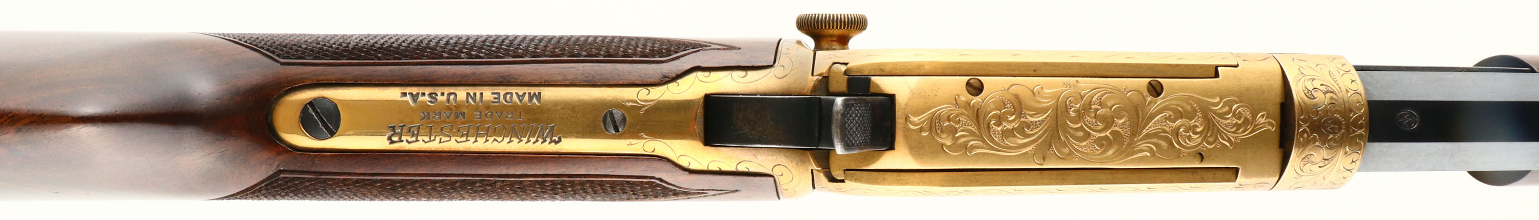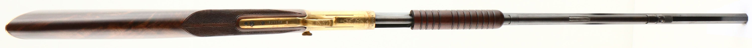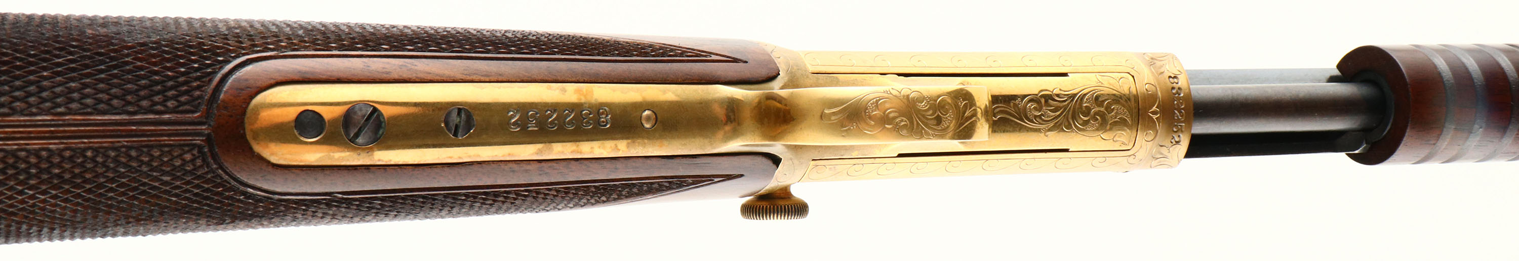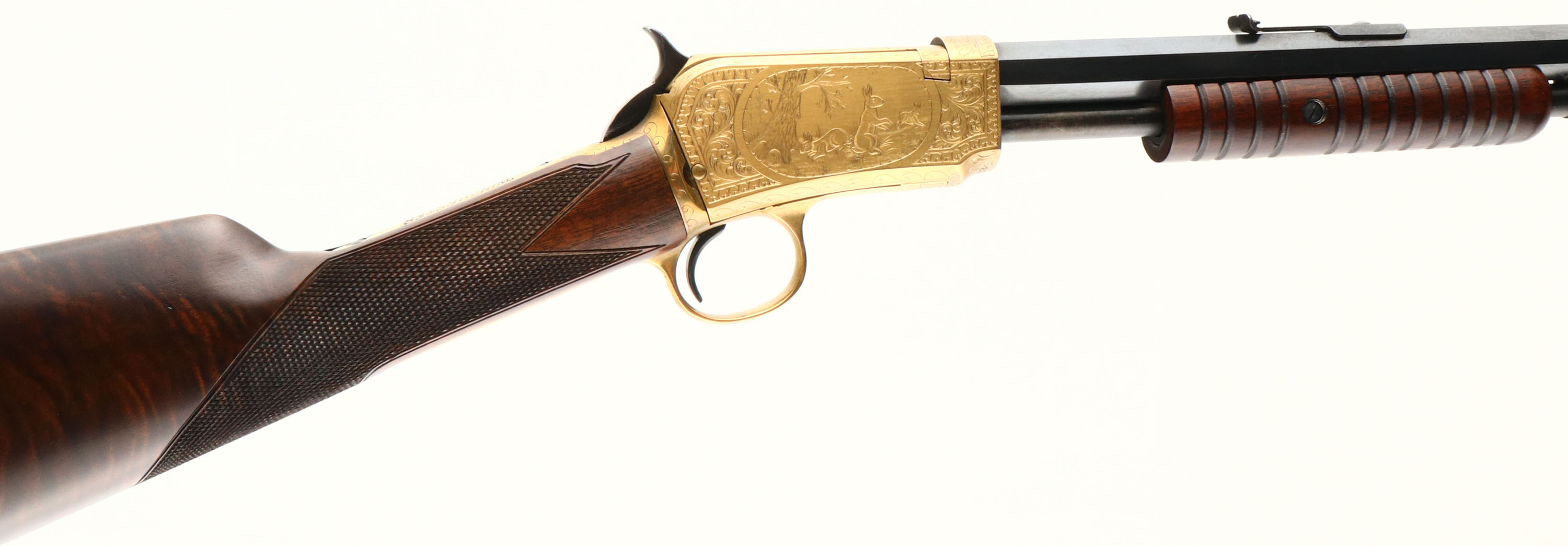 FANTASTIC CUSTOM ENGRAVED Winchester, Model 1890 3rd model, .22 WRF Cal., MFG. 1930, SN: 832252, Pump Action Rifle, 24'' Tapered Octagon barrel, The receiver & trigger guard are elaborately scroll engraved, with forest scenes depicting two squirrels on the left side of the receiver & three rabbits on the right side. There is also light scroll & border engraving on the upper tang of the buttplate. This engraving is as shown on pg. 125 of ''Winchester - An American Legend'' by R. L. Wilson as being Winchesters No. 8 style, ''Especially suitable for rifles having small frames, such as the Model 1890 & the Single Shot''. The straight grip walnut stock has deluxe fancy Winchesters ''H'' style hand checkering, with a satin lacquer finish. Checkering is crisp. The stock has fabulous grain & excellent finish, with virtually no handling marks. There are two 1'' tightly glued grain cracks at the left side of the buttend against the buttplate, that were part of the popped grain & likely stabilized before the stock was originally finished. The corncob forearm & finish are excellent. The factory metal blue finish on barrel is 90%, 80% on mag, with loss due to pump action. The gold-wash on the receiver & crescent buttplate is excellent. Bore is excellent. Factory front & rear sights. A truly wonderful & excellent condition deluxe model 90. FFL or C&R Req. - Value: 4000 to 8000