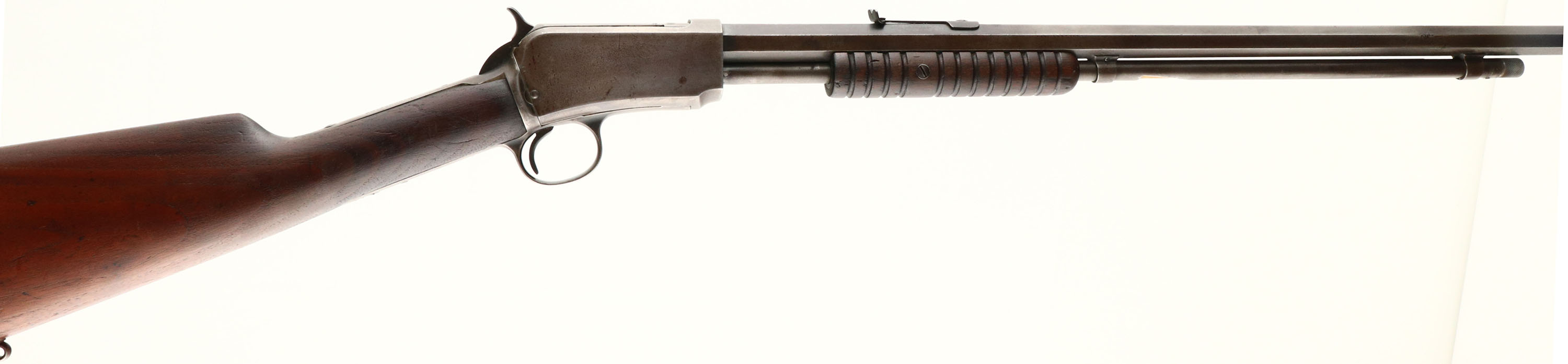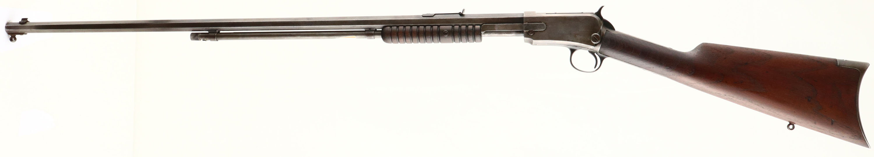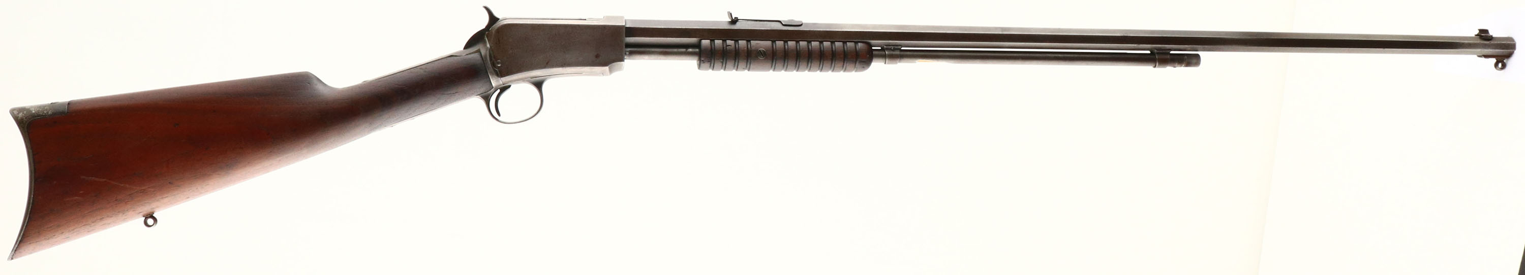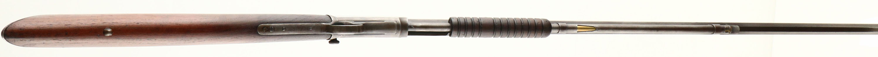 ULTRA RARE Winchester, Model 1890 SPECIAL ORDER GALLERY, 2nd variation, .22 SHORT Cal., MFG: 1899, SN: 68515, Pump Action Rifle, This rifle comes with a Cody Factory Record Letter indicating this rifle was ordered with an extremely rare 29'' Octagonal barrel. Standard barrel length of an 1890/90 was 24'', with over 850,000 produced. According to the highly detailed book ''Winchester Slide Action Rifle, Volume 1: Model 1890 & Model 1906'', by Ned Schwing, only 57 rifles had barrels longer than the standard. 10 had 26'' barrels & 47 had 29'' barrels. He states, ''all 47 of these 29'' barrel model 1890's were ordered by the same individual.'' It is likely since all these Gallery 29'' barrel rifles were ordered by the same customer, they were likely meant for use in a Shooting Gallery. In the ''Winchester Handbook'' by George Madis, there is a photo of one of these very rare 29'' rifles. Interestingly, the rifle pictured does not possess another very rare feature of this rifle. As mentioned in the factory records, this rifle was ordered with a set of sling eyelets, with the forward eyelet placed at the muzzle end. Another example of these 29'' rifles has also been observed with this ''loop under muzzle'' feature. These muzzle loops were for attaching a thin chain to keep gallery shooters from either removing the rifle or swinging it in an unsafe manner. The original straight grip stock is very good & solid, as sanded & refinished, metal is proud to the wood. There are still numerous light scratches, nicks & ding, especially on the forend, as consistent with a gallery rifle. The records indicate this is a 1/2 Nickel rifle, which remnants of the original nickel finish remain on the buttplate & on the inside of the receiver. The rest of the nickel finish has long since worn away & is replaced with a thin brown patina, which matches the finish of the barrel & mag. The rifle is fitted with standard factory sights. Bore is fair & rough, but still has solid rifling. Original crescent metal buttplate. The triangle shaped gallery loading port has been enlarged, probably to facilitate quicker loading at the gallery back in the day. An exceptionally rare & very unique rifle from the golden era of shooting galleries. A very collectible piece of history. FFL or C&R Req. - Value: 2000 to 4000