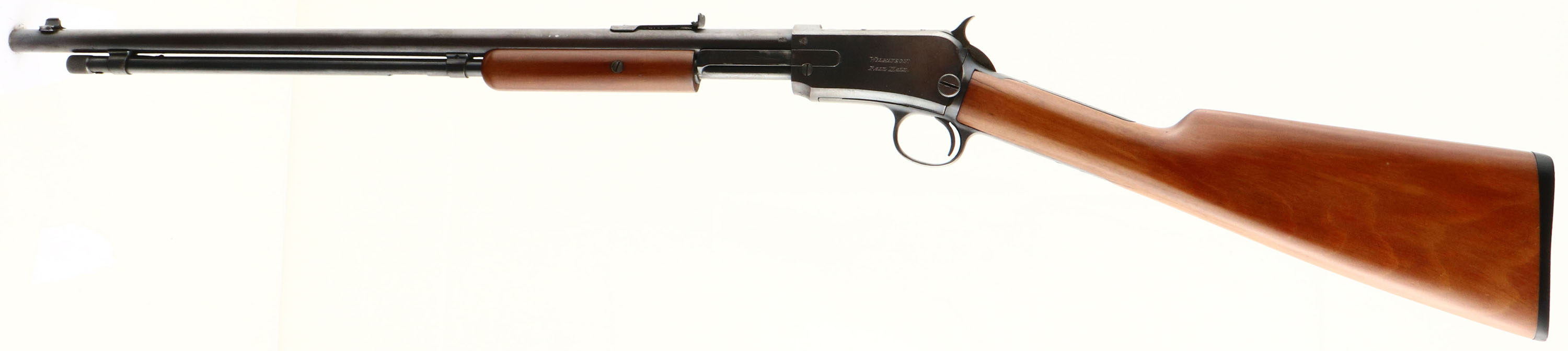 UNIQUE Winchester, Model 1906 , .22 SHORT., MFG: 1906, SN: 13760, Pump Action Rifle, 20'' Round barrel, This is a first year rifle, with British proof stampings on the barrel, bolt & receiver. It also carries the professional engraving of ''WILKINSON PALL MALL'' on the left side of the receiver. They were a British sword company that also sold guns & ammunitions. The original straight grip wood stocks are excellent. The forearm is the smooth style. The original finish is excellent, with virtually no rubs or handling marks. The original metal blue finish rates 75% overall, despite full coverage simply due to some thinning loss & barrel starting to tone slightly brown. Bore is good, but with areas of worn roughness amongst good rifling. Fitted with standard barrel sights. Winchester plastic buttplate, with engraved screws. Another truly excellent, original & collectible condition example. FFL or C&R Req. - Value: 1000 to 2500