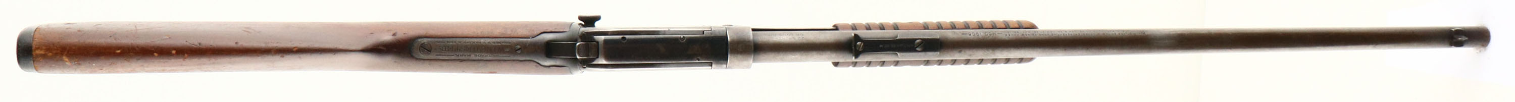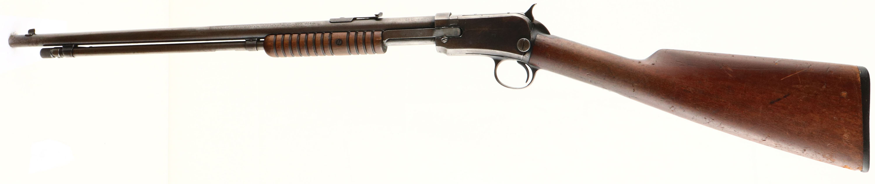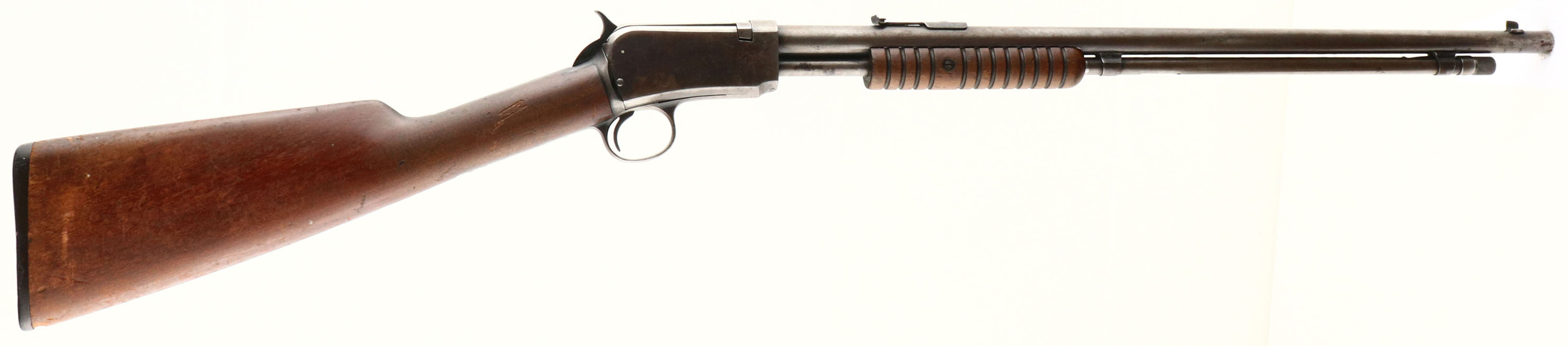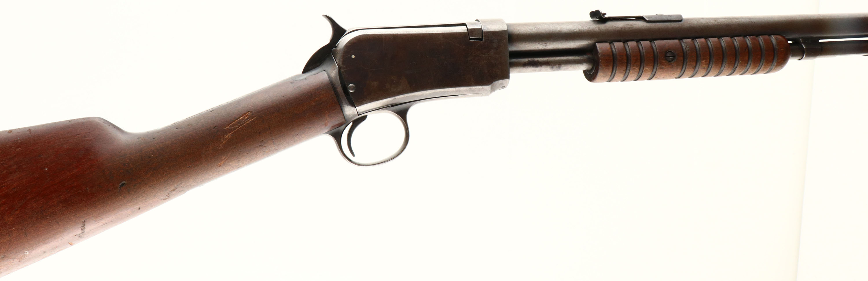 Winchester, Model 1906, .22 S. L. & LR. Cal., MFG. 1906, SN: 603564, Pump Rifle, 20'' Round barrel. Full Mag. The gum wood stock & 1890 style forearm are very good & solid, with several contusions, scrapes, scratches & knicks to the original finish. The original metal blue finish has worn mostly gray, only about 20% blue left on the receiver & the rest with a spotty thin brown patina. Original front & rear sights. Bore is very good. Worn original Winchester buttplate. FFL or C&R Req. - Value: 400 to 800