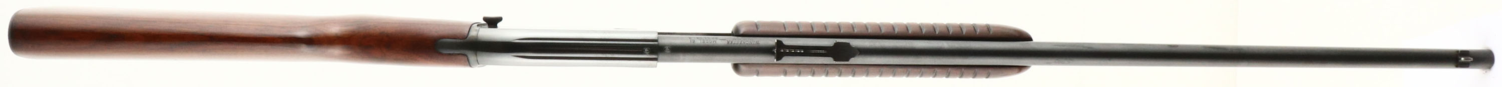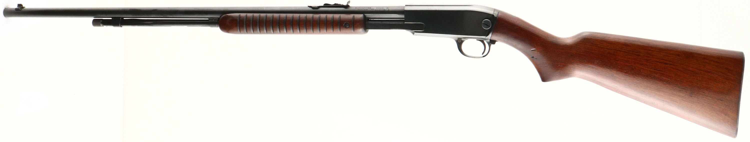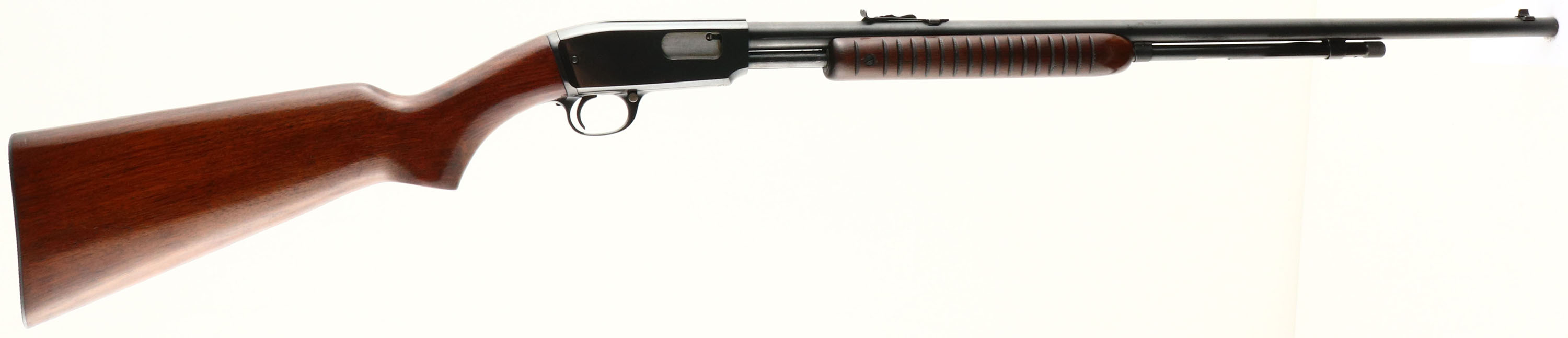 Winchester, Model 61, CAL: 22 S, L & LR, MFG: 1956, SN: 231094, Pump Action Rifle, 24'' barrel. Take-down Rifle. 24'' tapered round barrel. Slotted receiver for potential scope. This rifle has been fully & professionally restored to near factory original standards. The factory flat knob pistol grip wood stocks are excellent, displaying excellent restored finish & only a few minor contusions or scuffs. The restored metal blue finish rates 98% overall, with wear loss due pump slide action. Bore is excellent. Standard open sights. Checkered factory plastic buttplate. Overall, an excellent condition & beautiful 61 rifle. FFL or C&R Req. - Value: 500 to 1000