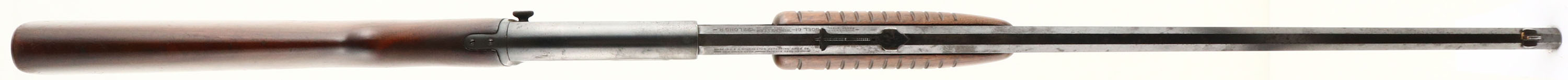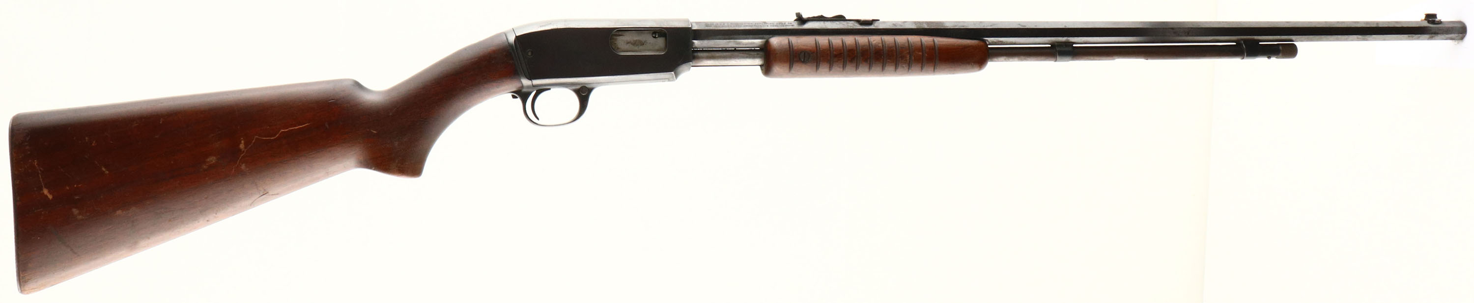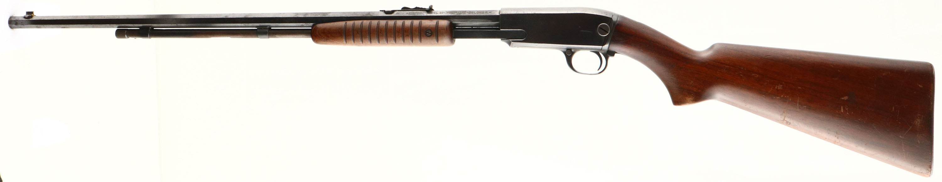 Winchester, Model 61, Marked .22 LONG R. Cal., MFG: 1937 (Pre-War), SN: 35299, Pump Action Rifle, Rare 24'' Octagon barrel. Rarer single caliber configuration. The original flat pistol grip wood stock & forearm are very good. The original finish is very good, with numerous small scratches, scrapes & contusions to the original flaking finish. Has the early production small corncob forearm, with the flat belly & tapered tip. The original metal blue finish is starting to gray, with 70% coverage on the barrel & receiver, 30% on the mag tube, with lots of rust speckling, spotting & haze. Factory sights. Bore is very good. Buttstock carries a checkered metal buttplate. A worn, but original octagon, single caliber 61. FFL or C&R Req. - Value: 400 to 800