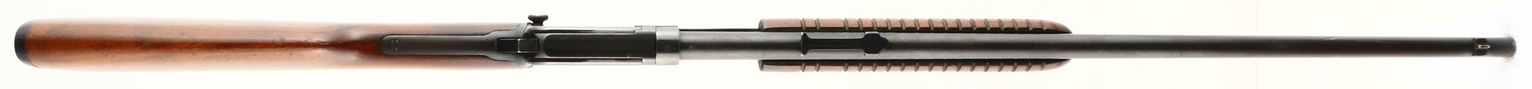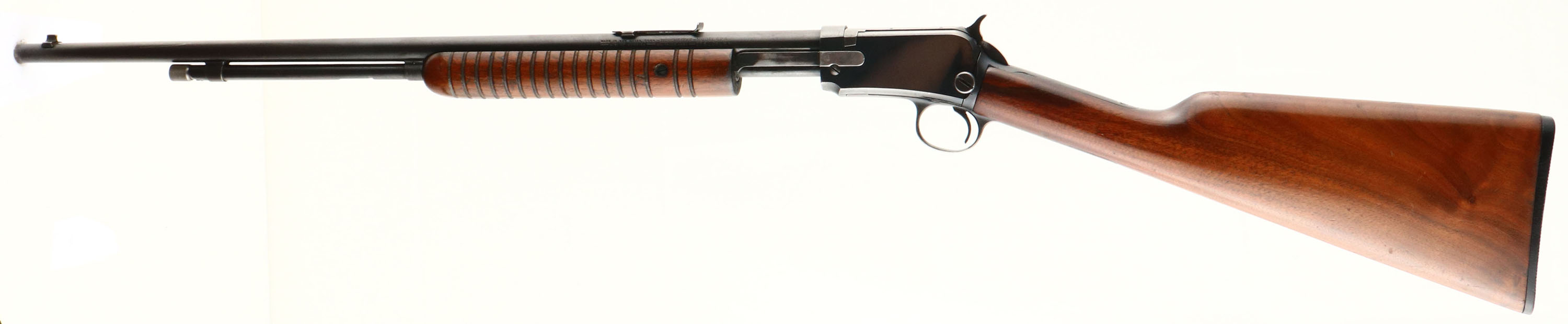 Winchester, Model 62A, CAL: 22 S.L.LR, MFG: 1948, SN: 251908, Pump Action Rifle, 23'' barrel. The original straight grip wood stock & corncob style forearm are excellent. They carry an added thin protective layer of finish over the original factory finish. There are a few light contusions, surface scrapes & rubs The metal blue finish rates 85% overall. Bore is excellent. The barrel holds an adjustable rear sight missing the adjustment elevator & blade front sight. Buttstock carries a Winchester marked, checkered black plastic buttplate. Overall appearance is very good. FFL or C&R Req. - Value: 600 to 1200
