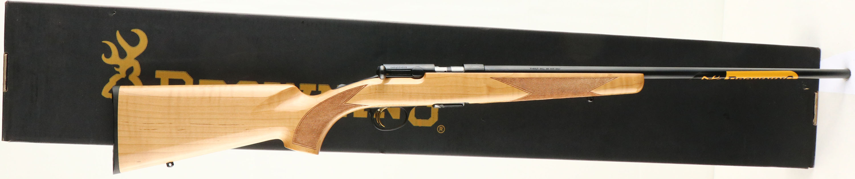 BOXED Browning, Model T-Bolt, MAPLE, CAL: 22 WMR, MFG: Modern, SN: 04210ZV253, Bolt Action Rifle, 22'' barrel. The original checkered & flat pistol grip AAA maple stock is excellent. The high gloss original finish is basically perfect. The original high gloss metal finish rates 100% overall. Bore is excellent. Receiver carries four factory scope mounting holes along the top, while the barrel has no open sight provisions. The buttstock carries a Browning buttplate. Original Browning detachable mag. Gold trigger. Sling studs. Browning retail sticker remains on the barrel. Comes basically NOS, in the original box, with lock & paperwork. An excellent Maple bolt .22 WMR rifle. FFL Req. - Value: 700 to 900
