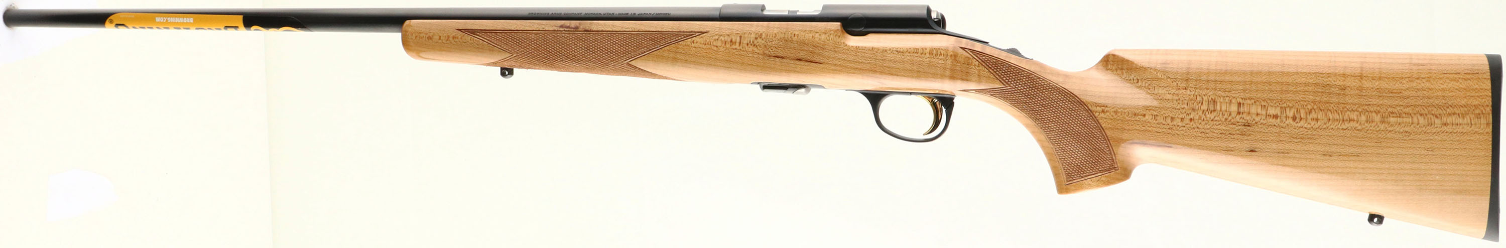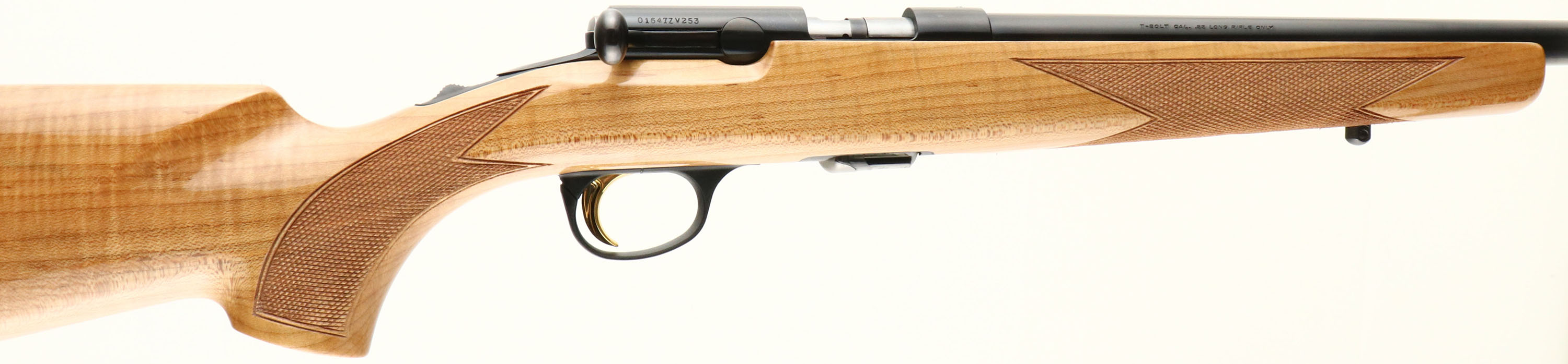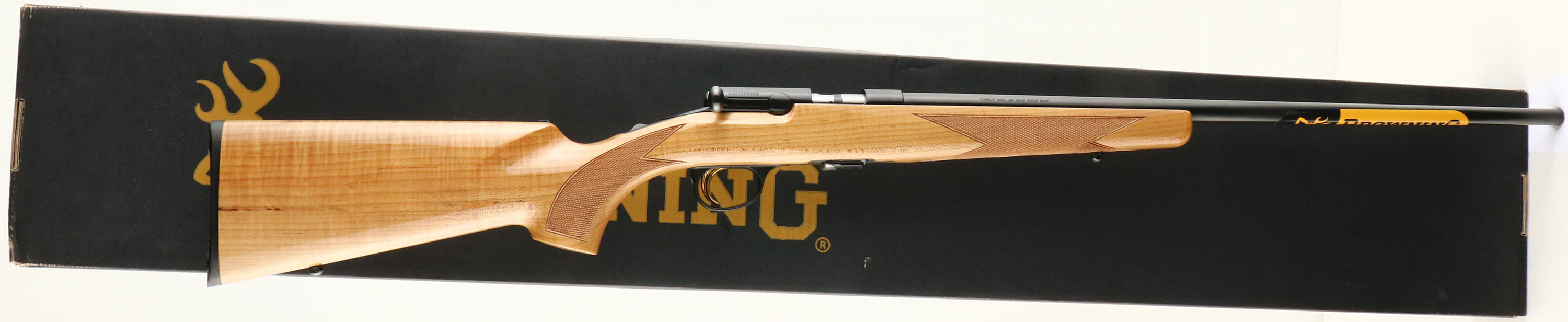BOXED Browning, Model T-Bolt, MAPLE, CAL: 22 LR, MFG: Modern, SN: 01647ZV253, Bolt Action Rifle, 22'' barrel. The original checkered & flat pistol grip AAA maple stock is excellent. There is a single pin head size ding at the point of the comb to the high gloss original finish, otherwise perfect. The original high gloss metal finish rates 100% overall. Bore is excellent. Receiver carries four factory scope mounting holes along the top, while the barrel has no open sight provisions. The buttstock carries a Browning buttplate. Original Browning detachable mag. Gold trigger. Sling studs. Browning retail sticker remains on the barrel. Comes basically NOS, in the original box, with lock & paperwork. An excellent Maple bolt .22 rifle. FFL Req. - Value: 600 to 900