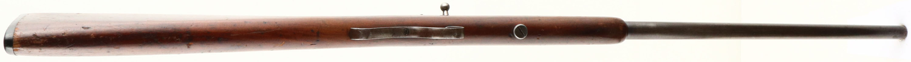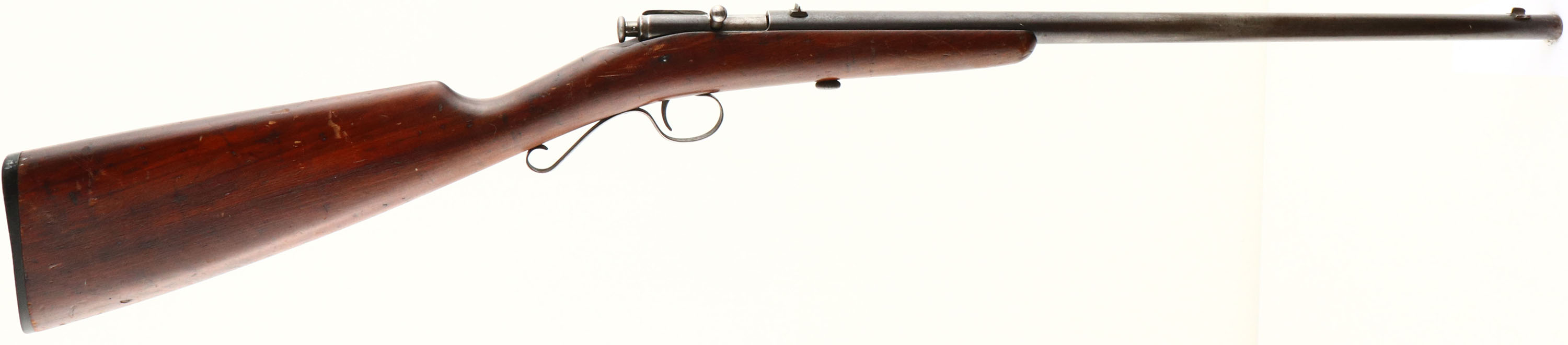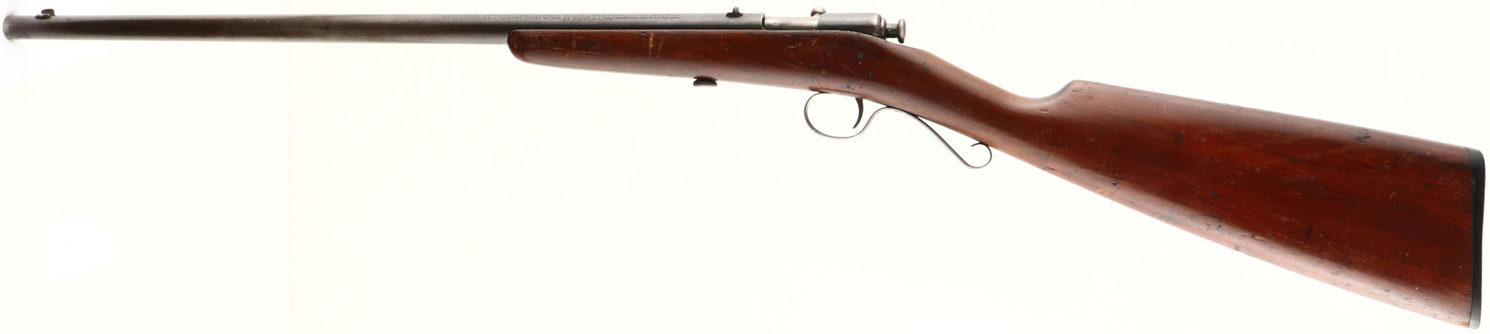 Winchester, Model 1902, Early first variation, .22 Short & Long (not marked Extra Long like later examples) Cal., MFG. 1902-03, SN: None, Bolt Action Rifle, 18'' Tapered round barrel. The original wood stock is very good & solid, with numerous minor handling marks, contusions & scratches. The metal blue has worn mostly gun metal gray, with a thin brown patina. Bore is fair, with some roughness amongst thinning rifling. The barrel holds a fixed rear & small blade front sights. Stock carries the original worn hard rubber buttplate, with engraved screws. ''S'' trigger guard. FFL or C&R Req. - Value: 200 to 400