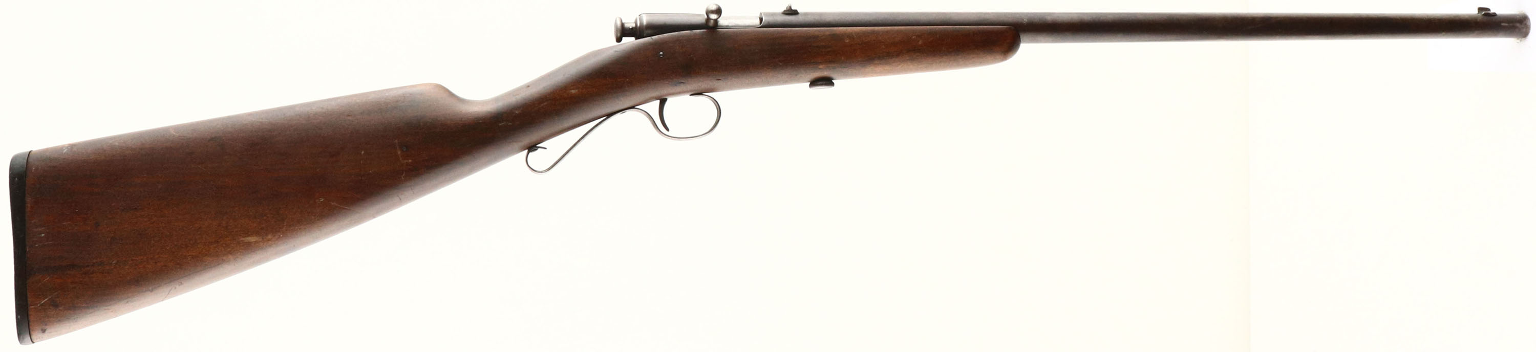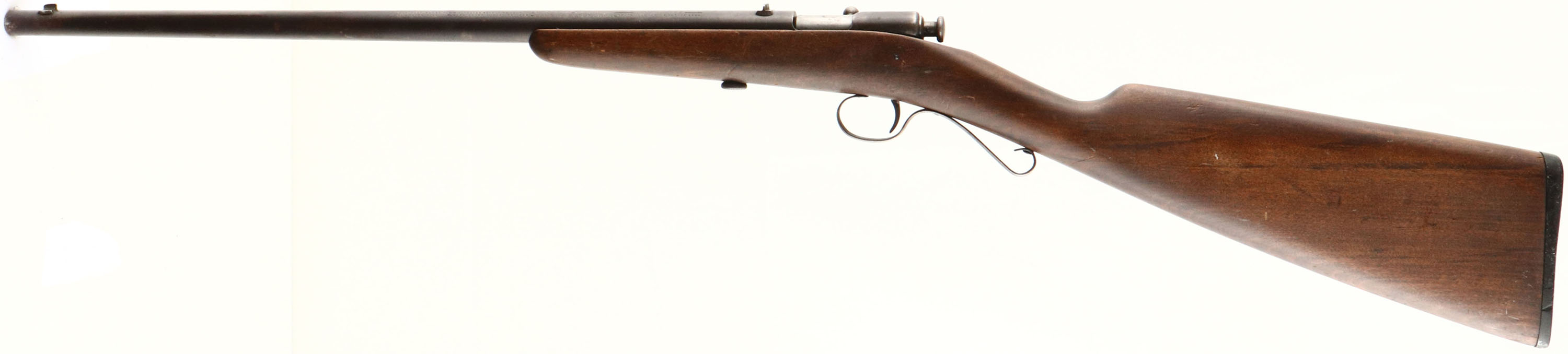 Winchester, Model 1902, CAL: 22 Short, Long & Ex Long, MFG: 1902-31, SN: NSN, Bolt Action Rifle, 18'' barrel. Later version adding the Ex Long stamping The original straight grip wood stock is excellent & solid, with several minor contusions & scratches to the original finish. The metal finish has worn to a chocolate brown patina. Bore is fair, with roughness amongst thinning rifling. The barrel holds a factory rear & small blade front sights. Stock carries the original worn hard rubber buttplate, with engraved screws. ''S'' shaped trigger guard. FFL or C&R Req. - Value: 200 to 400