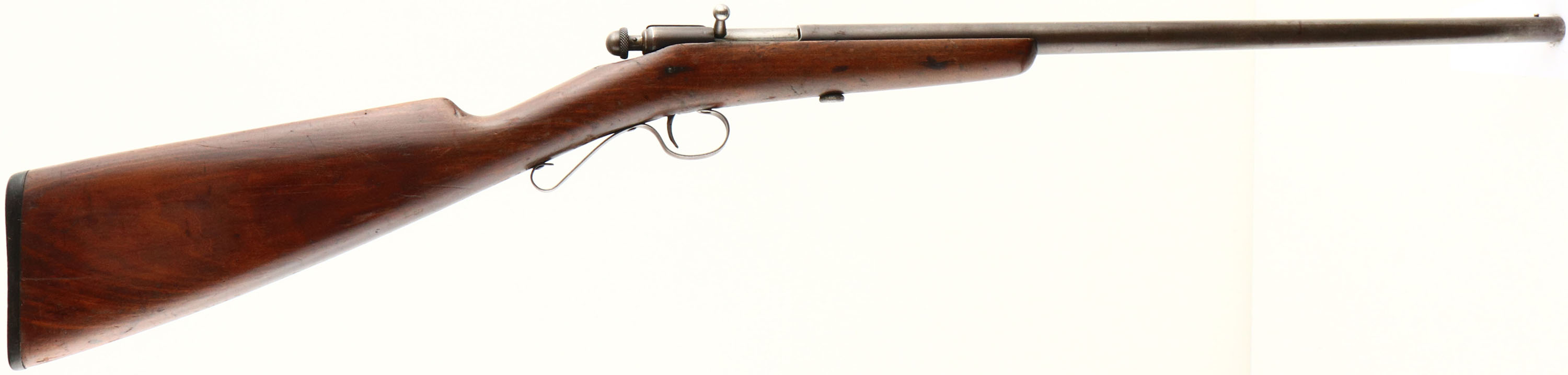 Winchester, Model 36 SHOTGUN, 9mm Rim Fire Cal., MFG. 1920-27, SN: None, Bolt Action Rifle, Only 20,000+ produced, 17 1/2'' Tapered round barrel. The original straight grip wood stock is very good, with lots of minor scuffs, scrapes & contusions to the original finish. The original metal finish has worn to gun metal gray, with a thin brown patina, Bore is very good. Single bead front sight. Original ''Winchester'' plastic buttplate, with engraved screw heads. Scalloped trigger guard. A solid original example of a rare & collectible little smoothbore/shotgun. FFL or C&R Req. - Value: 400 to 800