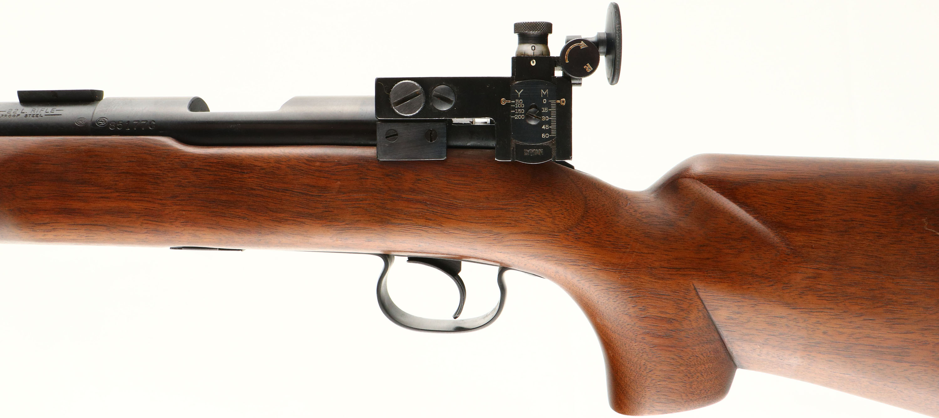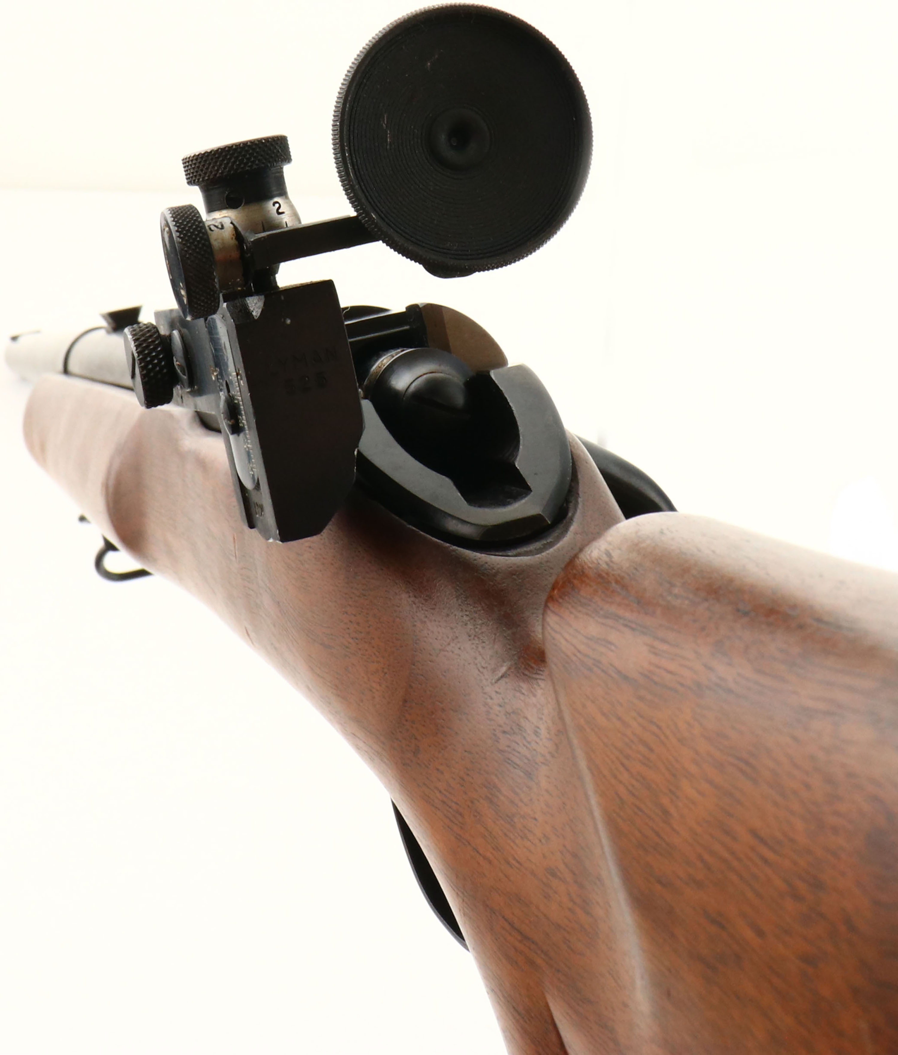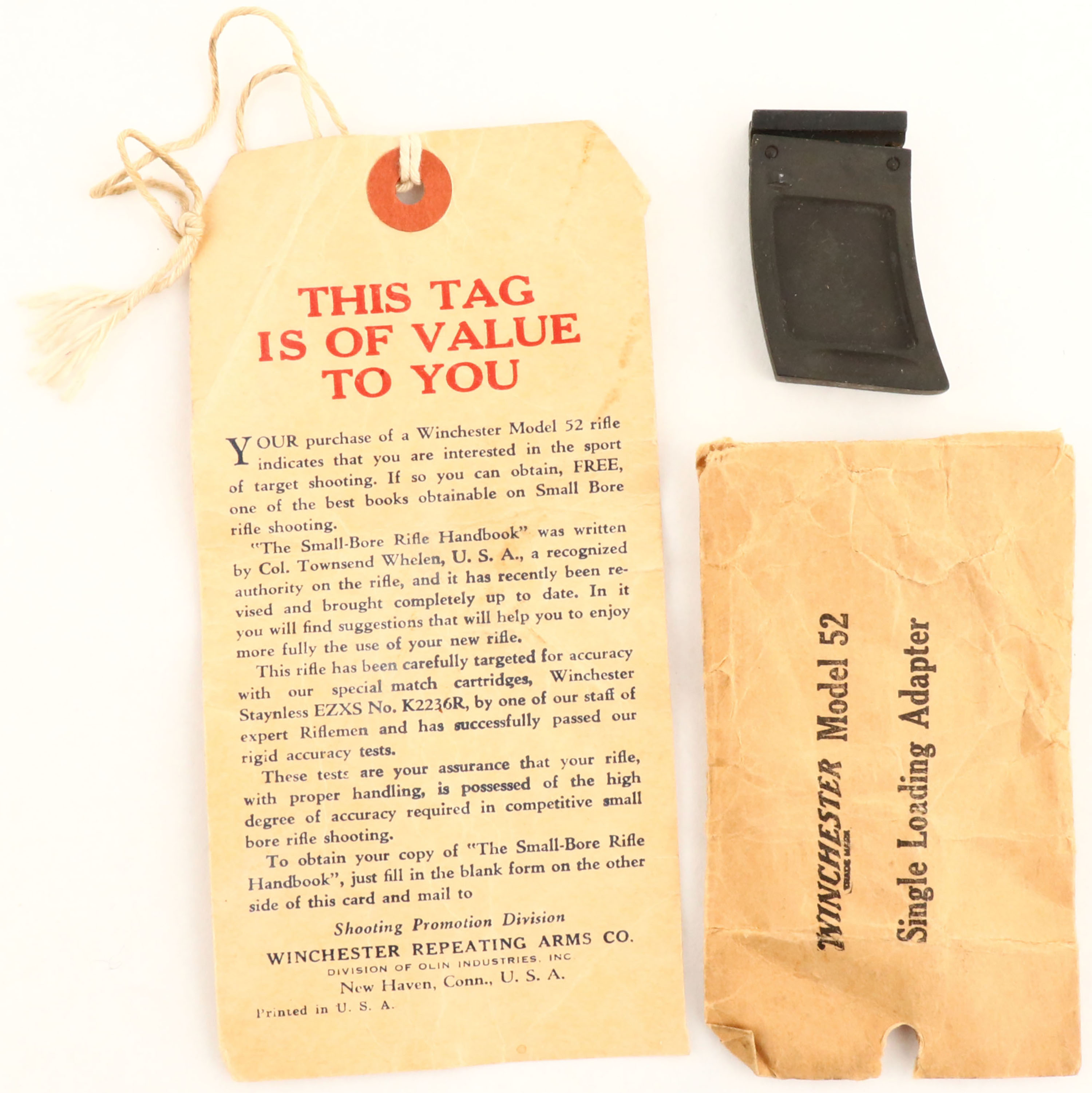 FANTASTIC Winchester, Model 52 C Target Rifle, marked 22 LR, MFG. 1959, SN: 85177C, Bolt action rifle, 28'' HEAVY BARREL, The original flat pistol grip, target American walnut stock is excellent, with very few light contusions & scratches to the excellent original factory finish. Wider beavertail forend. The original metal blue finish rates 99% overall. Receiver fitted with a fully adjustable, large disk aperture, Lyman receiver sight, while the barrel carries the factory scope or sight blocks & a blank filled front dovetail. Bore is excellent. The stock carries the factory metal checkered buttplate & sling swivels. The model ''C'' featured the Micro-Motion trigger with screw adjustment accessible forward of the trigger guard. Original Winchester marked detachable clip. Comes with the original Model 52 hangtag & original accessory envelope containing a second Winchester mag. An excellent, extremely high original condition target rifle. Very collectable in this rarely found condition & with original extras. FFL or C&R Req. - Value: 1500 to 2000